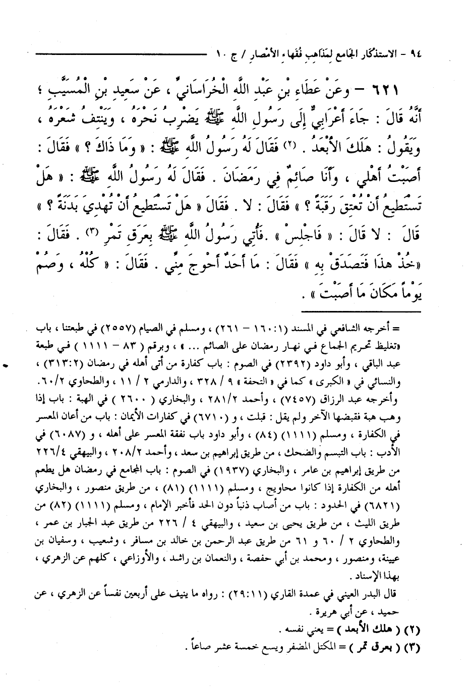 621 - وَعَنْ عَطَاءِ بْنِ عَبْدِ اللَّهِ الْخُرَاسَانِيِّ، عَنْ سَعِيدِ بْنِ الْمُسَيَّبِ ; أَنَّهُ قَالَ: جَاءَ أَعْرَابِيٌّ إِلَى رَسُولِ اللَّهَ - صَلَّى اللَّهُ عَلَيْهِ وَسَلَّمَ - يَضْرِبُ نَحْرَهُ، وَيَنْتِفُ شَعْرَهُ، وَيَقُولُ: هَلَكَ الْأَبْعَدُ. فَقَالَ لَهُ رَسُولُ اللَّهِ - صَلَّى اللَّهُ عَلَيْهِ وَسَلَّمَ -: " وَمَا ذَاكَ ؟ ". فَقَالَ: أَصَبْتُ أَهْلِي، وَأَنَا صَائِمٌ فِي رَمَضَانَ. فَقَالَ لَهُ رَسُولُ اللَّهِ - صَلَّى اللَّهُ عَلَيْهِ وَسَلَّمَ -: " هَلْ تَسْتَطِيعُ أَنْ تُعْتِقَ رَقَبَةً ؟. " فَقَالَ: لَا. فَقَالَ: " هَلْ تَسْتَطِيعُ أَنْ تُهْدِيَ بَدَنَةً ؟ ". قَالَ: لَا. قَالَ: " فَاجْلِسْ ". فَأُتِيَ رَسُولُ اللَّهِ - صَلَّى اللَّهُ عَلَيْهِ وَسَلَّمَ - بِعَرَقِ تَمْرٍ. فَقَالَ: " خُذْ هَذَا فَتَصَدَّقْ بِهِ " فَقَالَ: مَا أَحَدٌ أَحْوَجَ مِنِّي. فَقَالَ: " كُلْهُ، وَصُمْ يَوْمًا مَكَانَ مَا أَصَبْتَ ".