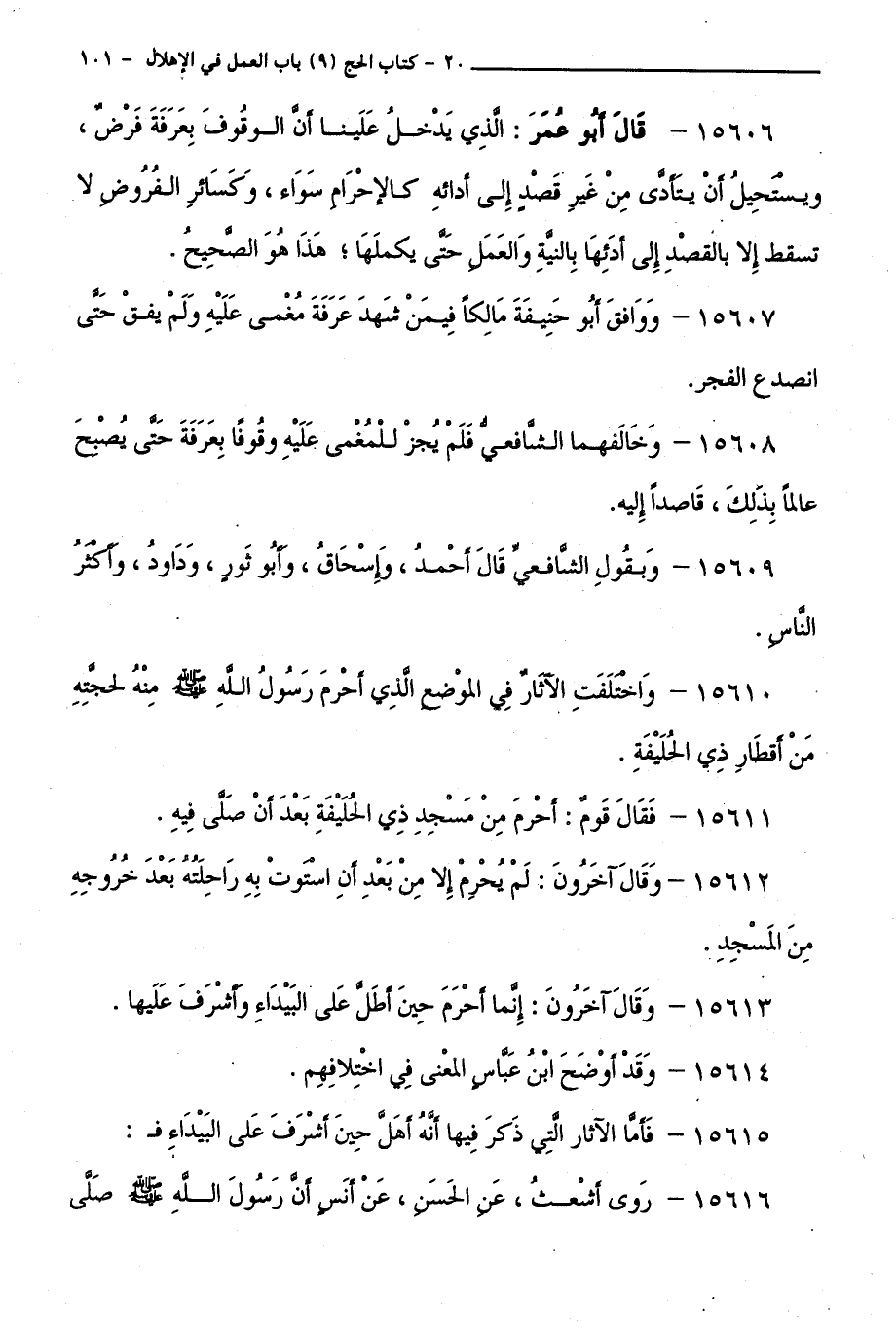 15610 - وَاخْتَلَفَتِ الْآثَارُ فِي الْمَوْضِعِ الَّذِي أَحْرَمَ رَسُولُ اللَّهِ - صَلَّى اللَّهُ عَلَيْهِ وَسَلَّمَ - مِنْهُ لِحِجَّتِهِ مِنْ أَقْطَارِ ذِي الْحُلَيْفَةِ.