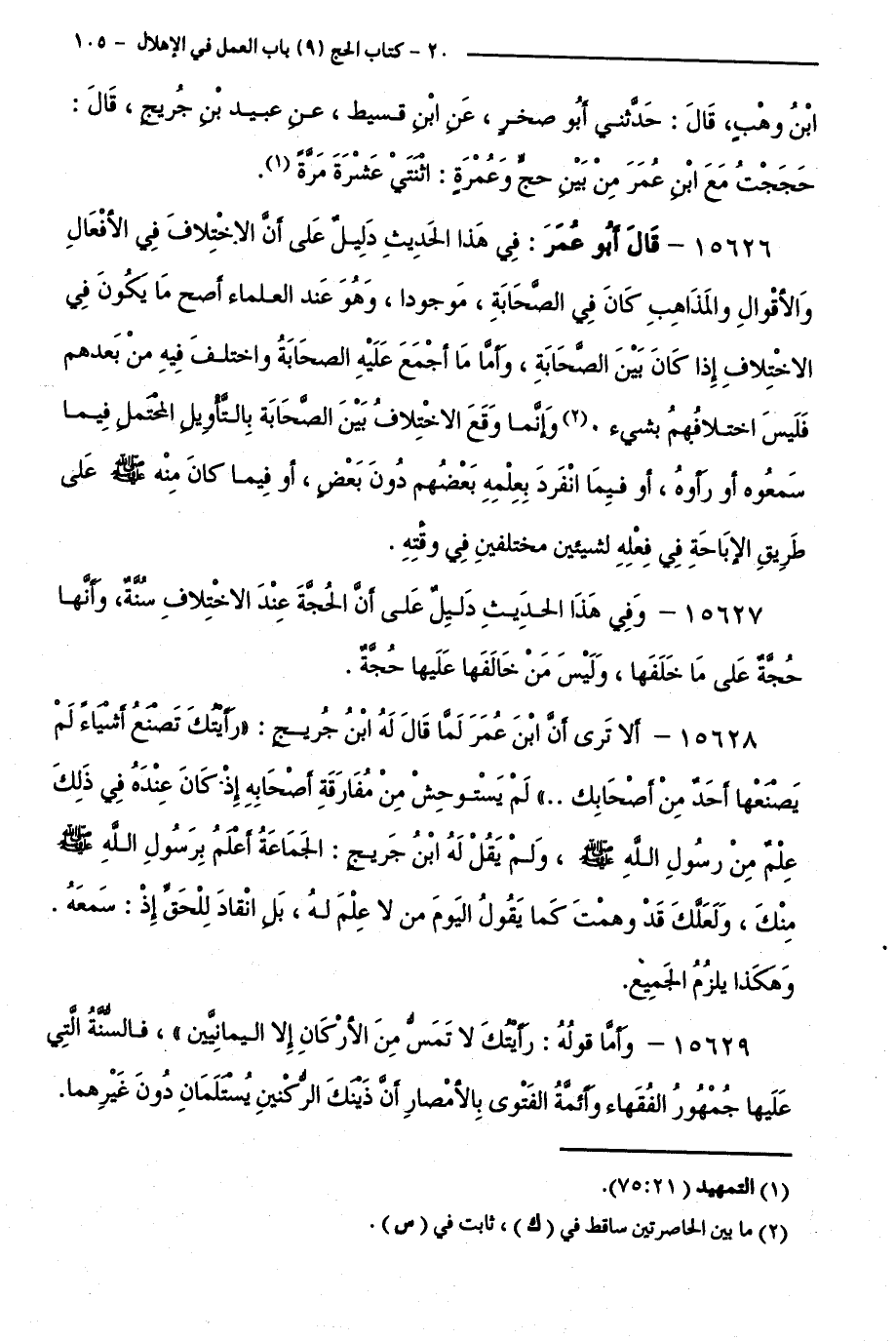 15628 - أَلَا تَرَى أَنَّ ابْنَ عُمَرَ لَمَّا قَالَ لَهُ ابْنُ جُرَيْجٍ: " رَأَيْتُكَ تَصْنَعُ أَشْيَاءَ لَمْ يَصْنَعْهَا أَحَدٌ مِنْ أَصْحَابِكَ... " لَمْ يَسْتَوْحِشْ مِنْ مُفَارَقَةِ أَصْحَابِهِ إِذْ كَانَ عِنْدَهُ فِي ذَلِكَ عِلْمٌ مِنْ رَسُولِ اللَّهِ - صَلَّى اللَّهُ عَلَيْهِ وَسَلَّمَ -، وَلَمْ يَقُلْ لِي ابْنُ جُرَيْجٍ: الْجَمَاعَةُ أَعْلَمُ بِرَسُولِ اللَّهِ - صَلَّى اللَّهُ عَلَيْهِ وَسَلَّمَ - مِنْكَ، وَلَعَلَّكَ قَدْ وَهِمْتَ كَمَا يَقُولُ الْيَوْمَ مَنْ لَا عِلْمَ لَهُ، بَلِ انْقَادَ لِلْحَقِّ إِذْ: سَمِعَهُ. وَهَكَذَا يَلْزَمُ الْجَمِيعُ.