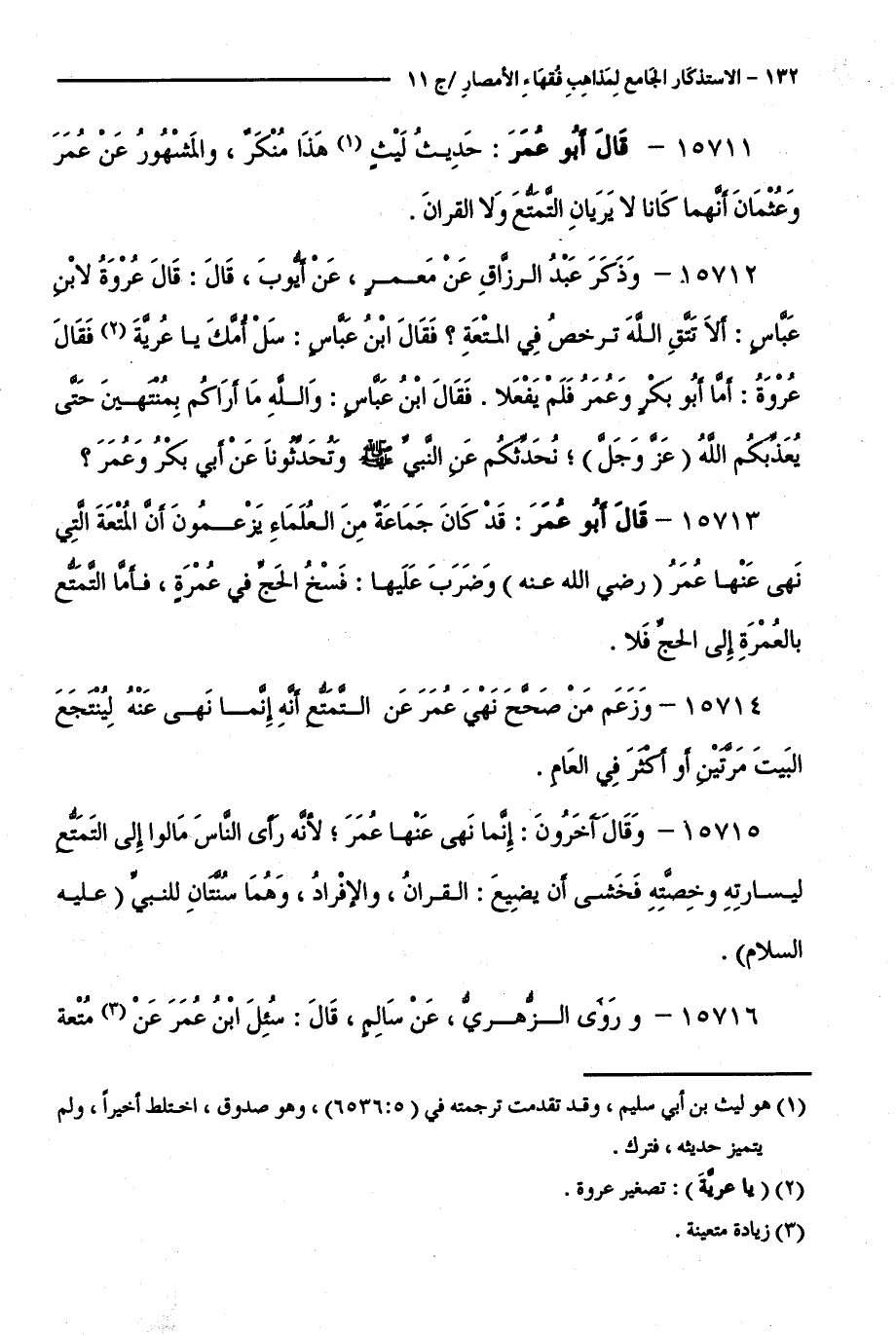 15713 - قَالَ أَبُو عُمَرَ: قَدْ كَانَ جَمَاعَةٌ مِنَ الْعُلَمَاءِ يَزْعُمُونَ أَنَّ الْمُتْعَةَ الَّتِي نَهَى عَنْهَا عُمَرُ ( رَضِيَ اللَّهُ عَنْهُ ) وَضَرَبَ عَلَيْهَا: فَسْخُ الْحَجِّ فِي عُمْرَةٍ، فَأَمَّا التَّمَتُّعُ بِالْعُمْرَةِ إِلَى الْحَجِّ فَلَا.