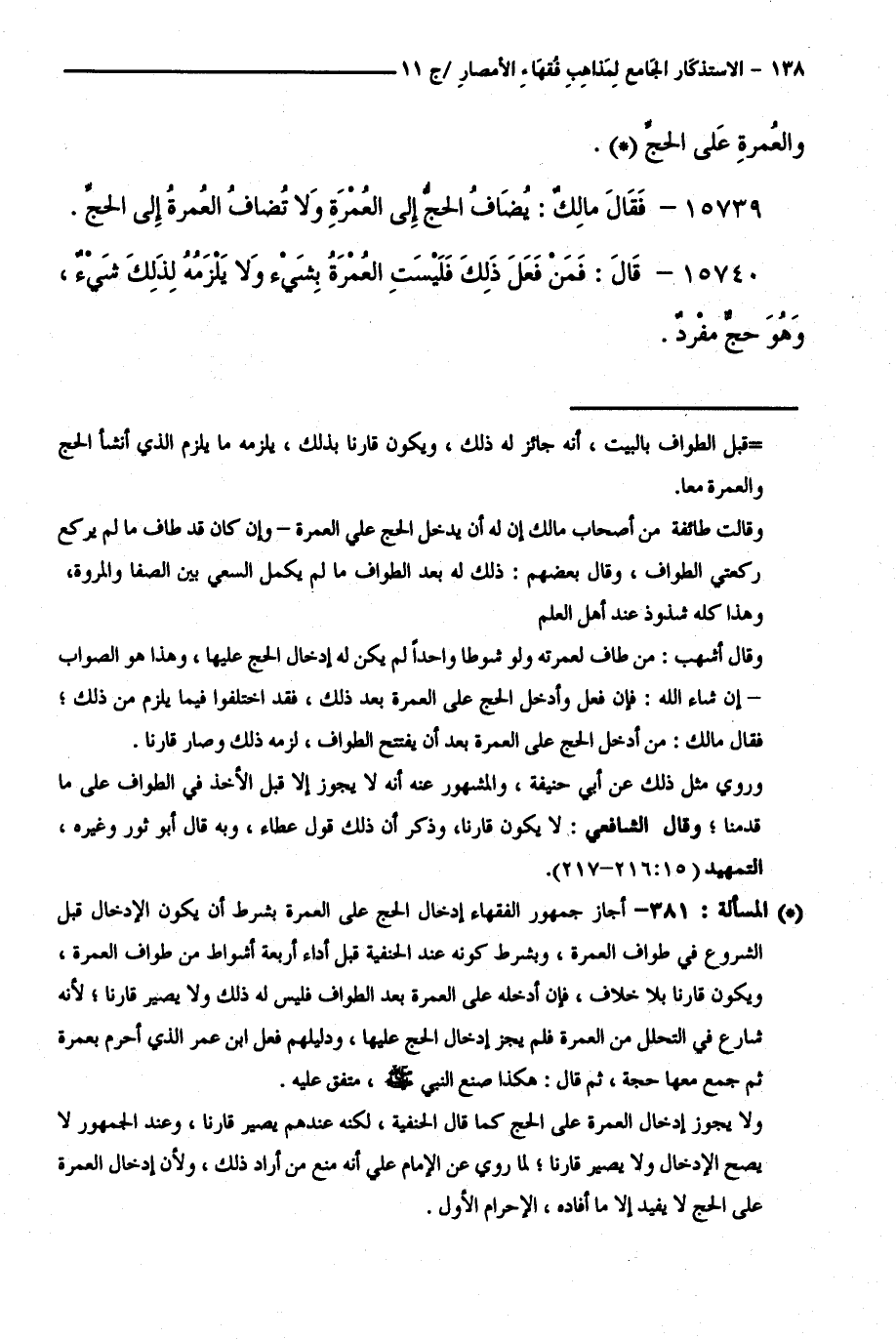 15739 - فَقَالَ مَالِكٌ: يُضَافُ الْحَجُّ إِلَى الْعُمْرَةِ وَلَا تُضَافُ الْعُمْرَةُ إِلَى الْحَجِّ.