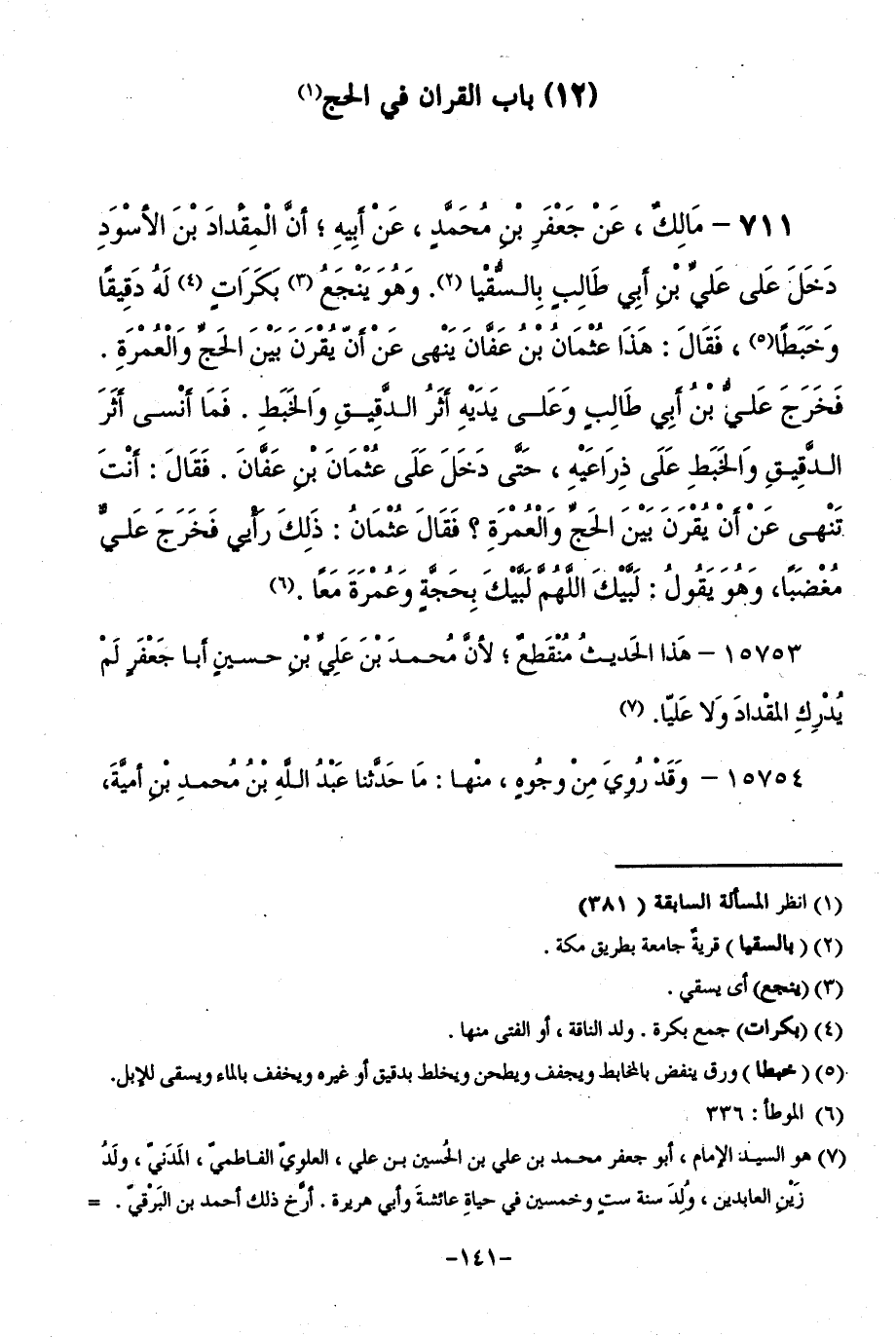711 - مَالِكٌ، عَنْ جَعْفَرِ بْنِ مُحَمَّدٍ، عَنْ أَبِيهِ ; أَنَّ الْمِقْدَادَ بْنَ الْأَسْوَدِ دَخْلَ عَلَى عَلِيِّ بْنِ أَبِي طَالِبٍ بِالسُّقْيَا، وَهُوَ يَنْجَعُ بَكَرَاتٍ لَهُ دَقِيقًا وَخَبَطًا، فَقَالَ: هَذَا عُثْمَانُ بْنُ عَفَّانَ يَنْهَى عَنْ أَنَّ يُقْرَنَ بَيْنَ الْحَجِّ وَالْعُمْرَةِ. فَخَرَجَ عَلِيُّ بْنُ أَبِي طَالِبٍ وَعَلَى يَدَيْهِ أَثَرُ الدَّقِيقِ وَالْخَبَطِ. فَمَا أَنْسَى أَثَرَ الدَّقِيقِ وَالْخَبَطِ عَلَى ذِرَاعَيْهِ، حَتَّى دَخَلَ عَلَى عُثْمَانَ بْنِ عَفَّانَ، فَقَالَ: أَنْتَ تَنْهَى عَنْ أَنْ يُقْرَنَ بَيْنَ الْحَجِّ وَالْعُمْرَةِ ؟ فَقَالَ عُثْمَانُ: ذَلِكَ رَأْيِي فَخَرَجَ عَلِيٌّ مُغْضَبًا، وَهُوَ يَقُولُ: لَبَّيْكَ اللَّهُمَّ لَبَّيْكَ بِحَجَّةٍ وَعُمْرَةٍ مَعًا.