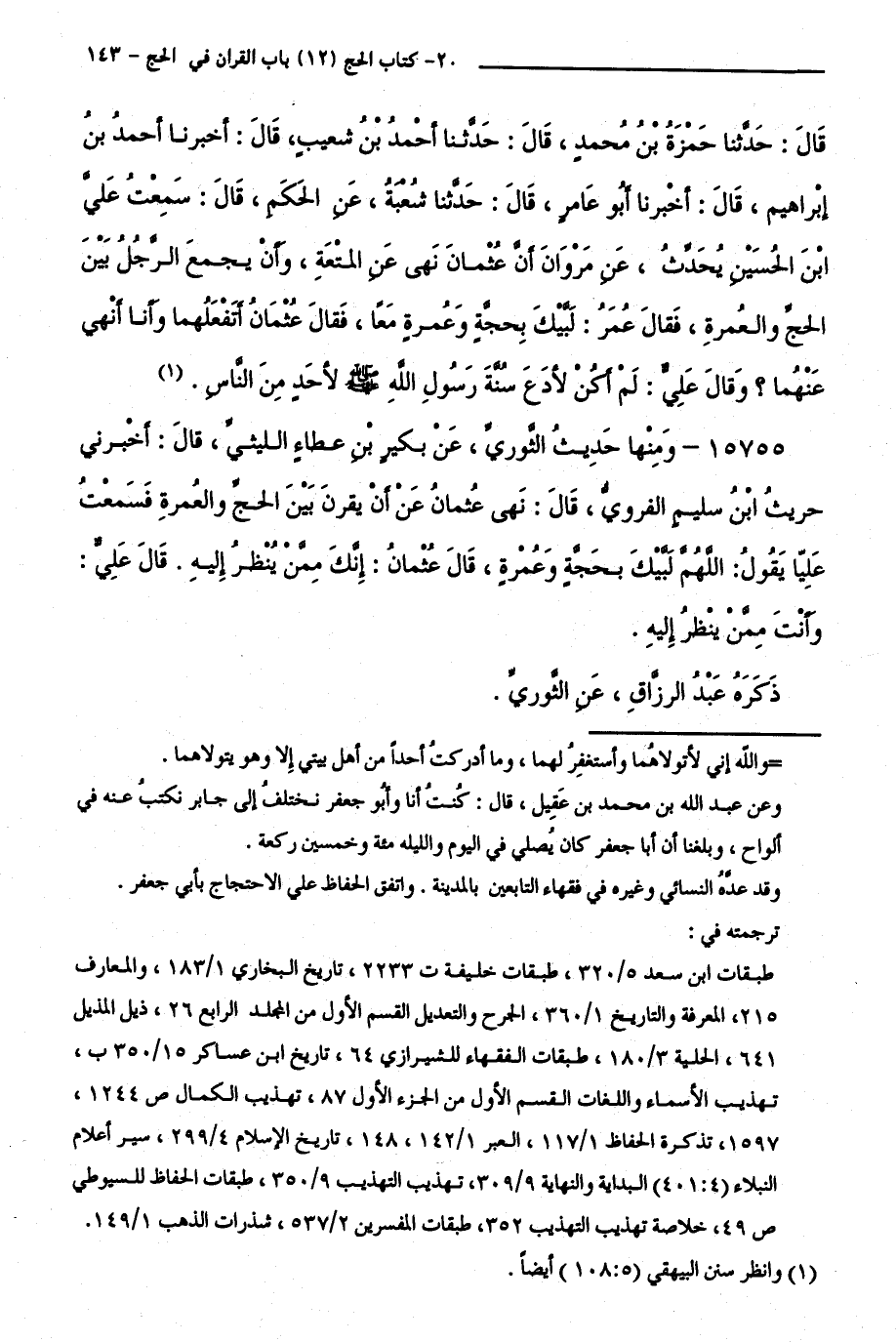 15755 - وَمِنْهَا حَدِيثُ الثَّوْرِيِّ، عَنْ بُكَيْرِ بْنِ عَطَاءٍ اللِّيثِيِّ، قَالَ: أَخْبَرَنِي حُرَيْثُ بْنُ سُلَيْمٍ الْفَرَوِيُّ، قَالَ: نَهَى عُثْمَانُ عَنْ أَنْ يُقْرَنَ بَيْنَ الْحَجِّ وَالْعُمْرَةِ فَسَمِعْتُ عَلِيًّا يَقُولُ: اللَّهُمَّ لَبَّيْكَ بِحَجَّةٍ وَعُمْرَةٍ، قَالَ عُثْمَانُ: إِنَّكَ مِمَّنْ يُنْظَرُ إِلَيْهِ. قَالَ عَلِيٌّ: وَأَنْتَ مِمَّنْ يُنْظَرُ إِلَيْهِ.