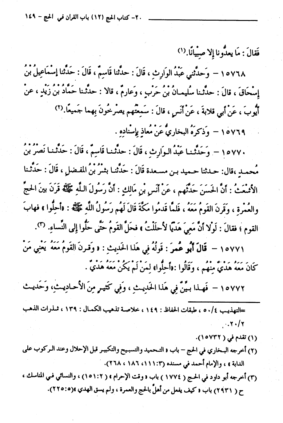 15768 - وَحَدَّثَنِي عَبْدُ الْوَارِثِ، قَالَ: حَدَّثَنَا قَاسِمٌ، قَالَ: حَدَّثَنَا إِسْمَاعِيلُ بْنُ إِسْحَاقَ، قَالَ: حَدَّثَنَا سُلَيْمَانُ بْنُ حَرْبٍ، وَعَارِمٌ، قَالَا: حَدَّثَنَا حَمَّادُ بْنُ زَيْدٍ، عَنْ أَيُّوبَ، عَنْ أَبِي قِلَابَةَ، عَنْ أَنَسٍ، قَالَ: سَمِعْتُهُمْ يَصْرُخُونَ بِهِمَا جَمِيعًا.