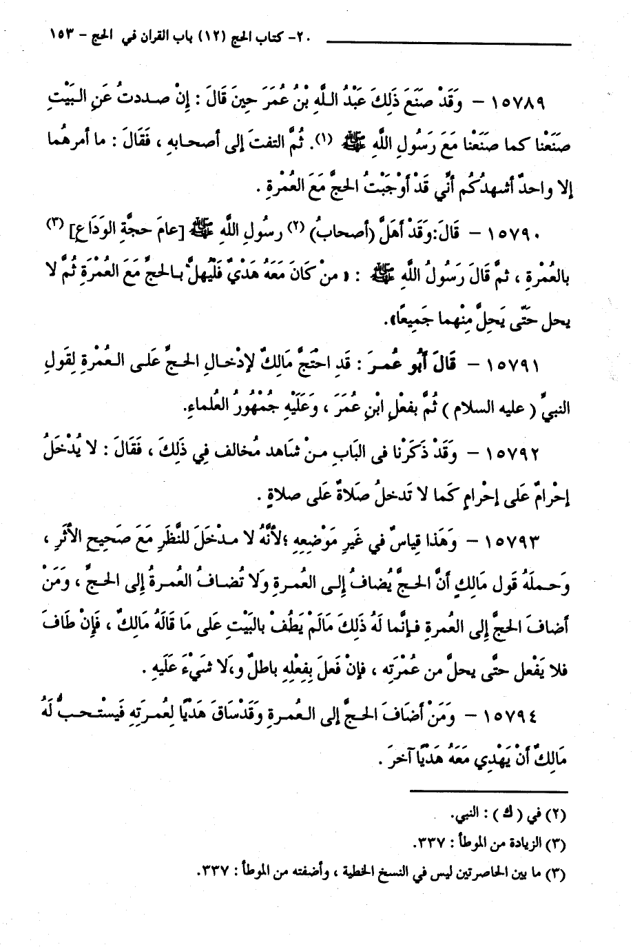 15791 - قَالَ أَبُو عُمَرَ: قَدِ احْتَجَّ مَالِكٌ لِإِدْخَالِ الْحَجِّ عَلَى الْعُمْرَةِ لِقَوْلِ النَّبِيِّ ( عَلَيْهِ السَّلَامُ ) ثُمَّ بِفِعْلِ ابْنِ عُمَرَ، وَعَلَيْهِ جُمْهُورُ الْعُلَمَاءِ.