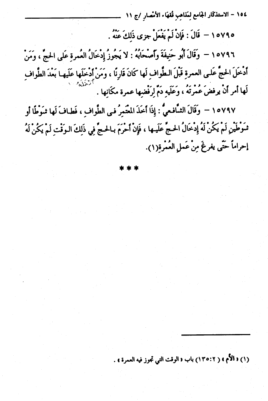 15797 - وَقَالَ الشَّافِعِيُّ: إِذَا أَخَذَ الْمُعْتَمِرُ فِي الطَّوَافِ، فَطَافَ لَهَا شَوْطًا أَوْ شَوْطَيْنِ لَمْ يَكُنْ لَهُ إِدْخَالُ الْحَجِّ عَلَيْهَا، فَإِنَّ أَحْرَمَ بِالْحَجِّ فِي ذَلِكَ الْوَقْتِ لَمْ يَكُنْ لَهُ إِحْرَامًا حَتَّى يَفْرُغَ مِنْ عَمَلِ الْعُمْرَةِ.