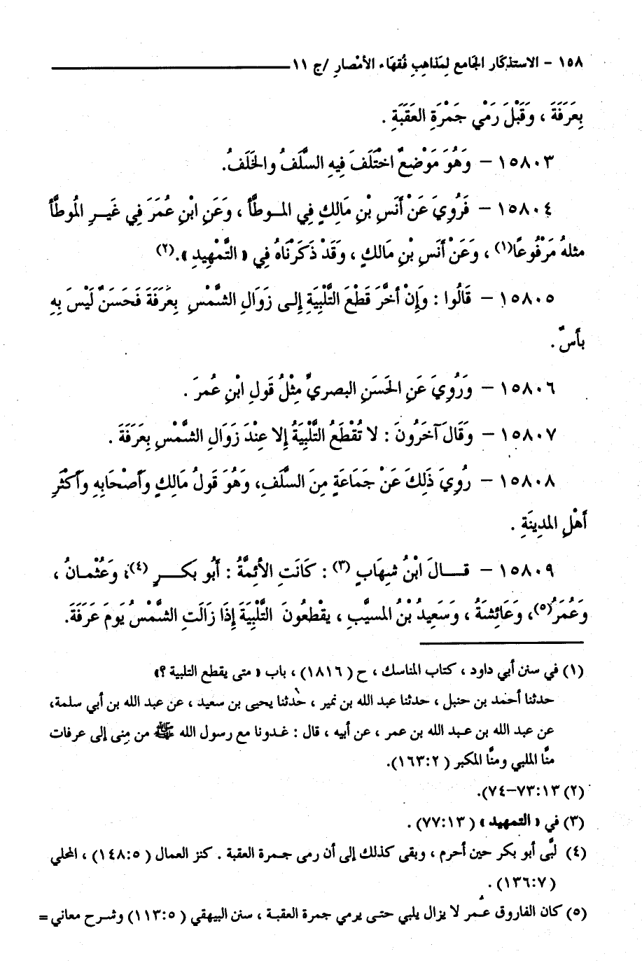 15809 - قَالَ ابْنُ شِهَابٍ: كَانَتِ الْأَئِمَّةُ: أَبُو بَكْرٍ، وَعُثْمَانُ، وَعُمَرُ، وَعَائِشَةُ، وَسَعِيدُ بْنُ الْمُسَيَّبِ، يَقْطَعُونَ التَّلْبِيَةَ إِذَا زَالَتِ الشَّمْسُ يَوْمَ عَرَفَةَ.