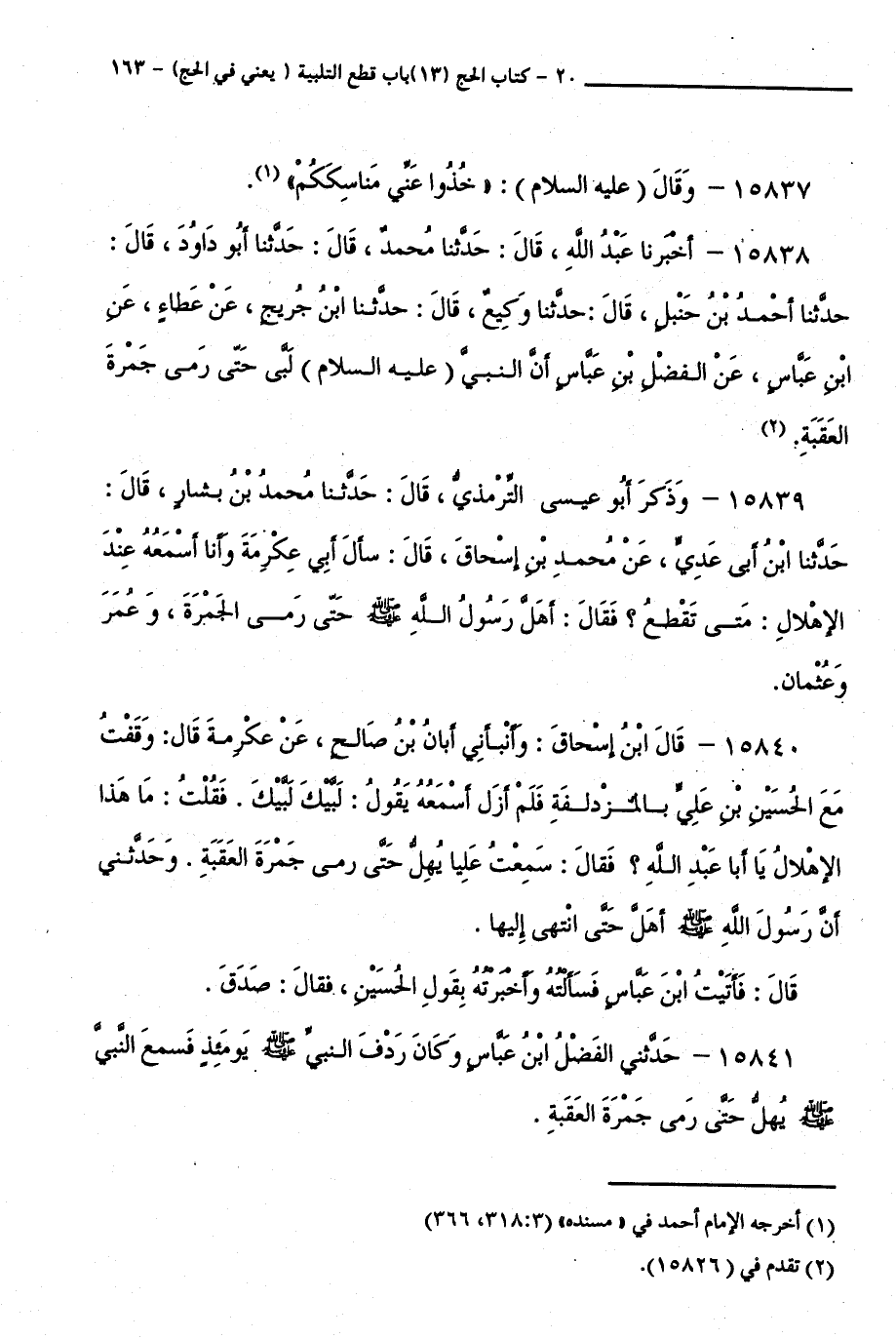 15838 - أَخْبَرَنَا عَبْدُ اللَّهِ، قَالَ: حَدَّثَنَا مُحَمَّدٌ، قَالَ: حَدَّثَنَا أَبُو دَاوُدَ، قَالَ: حَدَّثَنَا أَحْمَدُ بْنُ حَنْبَلٍ، قَالَ: حَدَّثَنَا وَكِيعٌ، قَالَ: حَدَّثَنَا أَبِي جُرَيْجٍ، عَنْ عَطَاءٍ، عَنِ ابْنِ عَبَّاسٍ، عَنِ الْفَضْلِ بْنِ عَبَّاسٍ أَنَّ النَّبِيَّ ( عَلَيْهِ السَّلَامُ ) لَبَّى حَتَّى رَمَى جَمْرَةَ الْعَقَبَةِ.