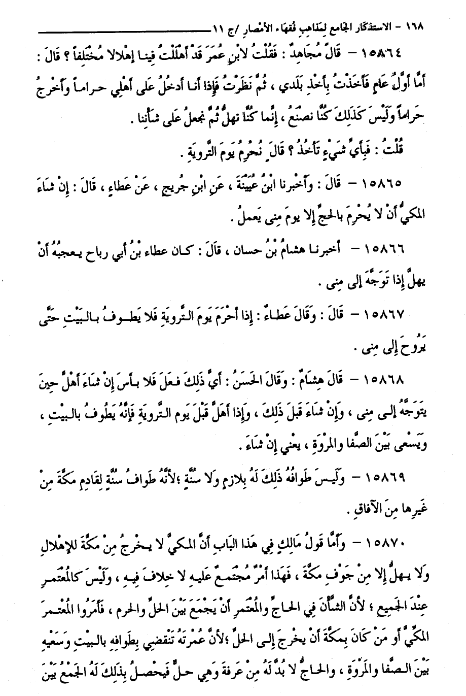 15866 - أَخْبَرَنَا هِشَامُ بْنُ حَسَّانَ، قَالَ: كَانَ عَطَاءُ بْنُ أَبِي رَبَاحٍ يُعْجِبُهُ أَنْ يُهِلَّ إِذَا تَوَجَّهَ إِلَى مِنًى.