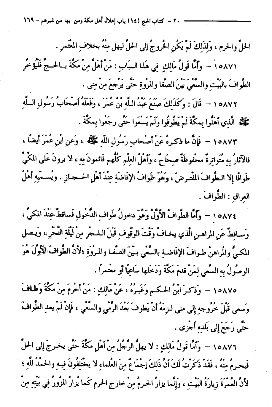 15871 - وَأَمَّا قَوْلُ مَالِكٍ فِي هَذَا الْبَابِ: مَنْ أَهَلَّ مِنْ مَكَّةَ بِالْحَجِّ فَلْيُؤَخِّرِ الطَّوَافَ بِالْبَيْتِ وَالسَّعْيَ مِنَ الصَّفَا وَالْمَرْوَةِ حَتَّى يَرْجِعَ مِنْ مِنًى.