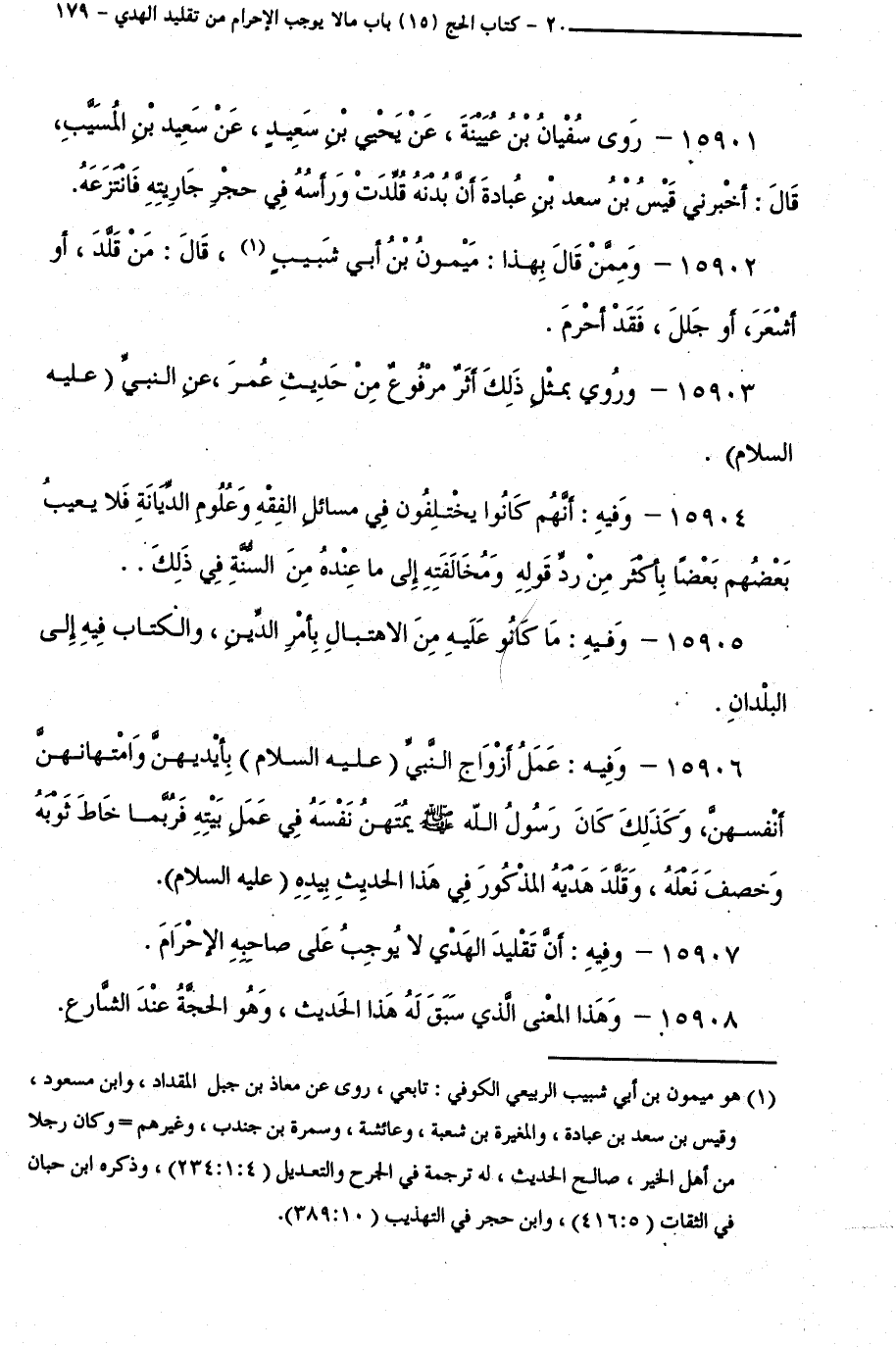 15901 - رَوَى سُفْيَانُ بْنُ عُيَيْنَةَ، عَنْ يَحْيَى بْنِ سَعِيدٍ، عَنْ سَعِيدِ بْنِ الْمُسَيَّبِ، قَالَ: أَخْبَرَنِي قَيْسُ بْنُ سَعْدِ بْنِ عُبَادَةَ أَنَّ بُدْنَهُ قُلِّدَتْ وَرَأْسُهُ فِي حِجْرِ جَارِيَتِهِ فَانْتَزَعَهُ.
