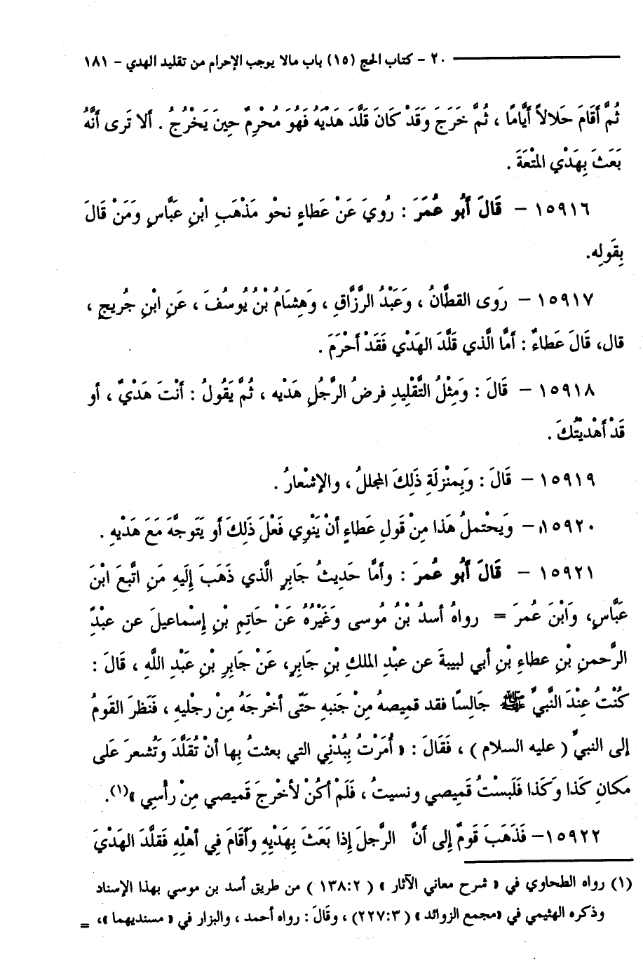 15921 - قَالَ أَبُو عُمَرَ: وَأَمَّا حَدِيثُ جَابِرٍ الَّذِي ذَهَبَ إِلَيْهِ مَنِ اتَّبَعَ ابْنَ عَبَّاسٍ، وَابْنَ عُمَرَ رَوَاهُ أَسَدُ بْنُ مُوسَى وَغَيْرُهُ عَنْ حَاتِمِ بْنِ إِسْمَاعِيلَ عَنْ عَبْدِ الرَّحْمَنِ بْنِ عَطَاءِ بْنِ أَبِي لَبِبَبَةَ عَنْ عَبْدِ الْمَلِكِ بْنِ جَابِرٍ، عَنْ جَابِرِ بْنِ عَبْدِ اللَّهِ، قَالَ: كُنْتُ عِنْدَ النَّبِيِّ - صَلَّى اللَّهُ عَلَيْهِ وَسَلَّمَ - جَالِسًا فَقَدَّ قَمِيصَهُ مِنْ جَنْبِهِ حَتَّى أَخْرَجَهُ مِنْ رِجْلَيْهِ، فَنَظَرَ الْقَوْمُ إِلَى النَّبِيِّ ( عَلَيْهِ السَّلَامُ )، فَقَالَ: " أَمَرْتُ بِبُدْنِي الَّتِي بَعَثْتُ بِهَا أَنْ تُقَلَّدَ وَتُشْعَرَ عَلَى مَكَانِ كَذَا وَكَذَا فَلَبِسْتُ قَمِيصِي وَنَسِيتُ، فَلَمْ أَكُنْ لِأُخْرِجَ قَمِيصِي مِنْ رَأْسِي ".