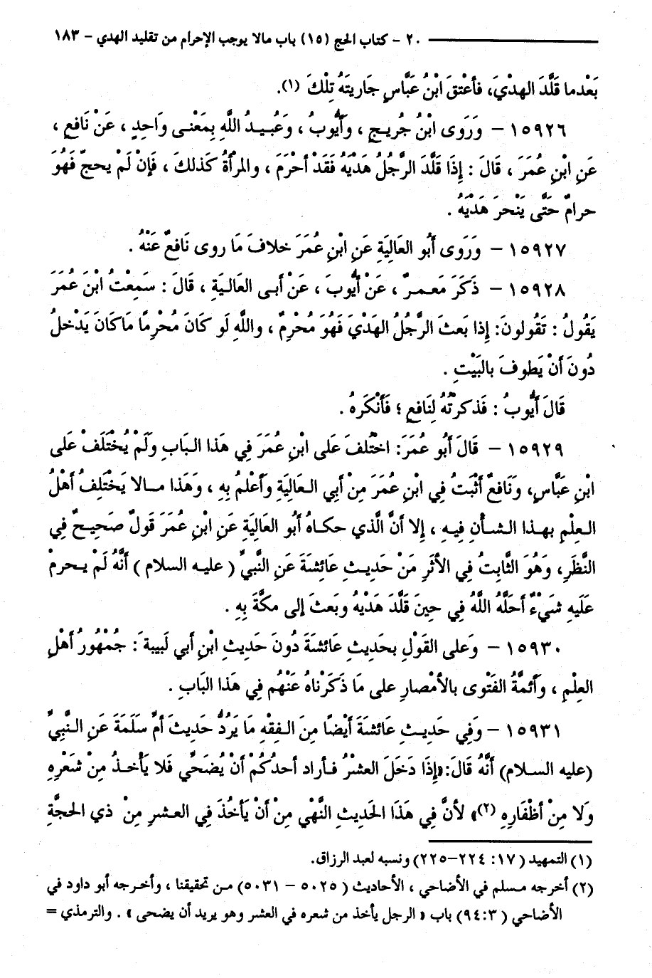 15926 - وَرَوَى ابْنُ جُرَيْجٍ، وَأَيُّوبُ، وَعُبَيْدُ اللَّهِ بِمَعْنًى وَاحِدٍ، عَنْ نَافِعٍ، عَنِ ابْنِ عُمَرَ، قَالَ: إِذَا قَلَّدَ الرَّجُلُ هَدْيَهُ فَقَدْ أَحْرَمَ، وَالْمَرْأَةُ كَذَلِكَ، فَإِنْ لَمْ يَحُجَّ فَهُوَ حَرَامٌ حَتَّى يَنْحَرَ هَدْيَهُ.