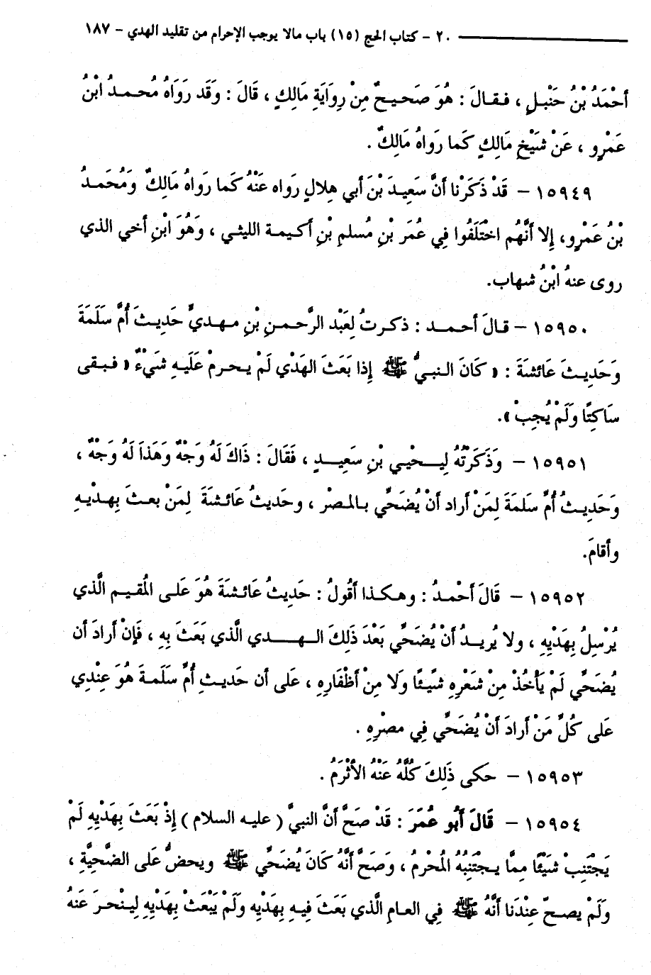 15950 - قَالَ أَحْمَدُ: ذَكَرْتُ لِعَبْدِ الرَّحْمَنِ بْنِ مَهْدِيٍّ حَدِيثَ أُمِّ سَلَمَةَ وَحَدِيثَ عَائِشَةَ: " كَانَ النَّبِيُّ - صَلَّى اللَّهُ عَلَيْهِ وَسَلَّمَ - إِذَا بَعَثَ الْهَدْيَ لَمْ يَحْرُمْ عَلَيْهِ شَيْءٌ " فَبَقَى سَاكِتًا وَلَمْ يُجِبْ ".
