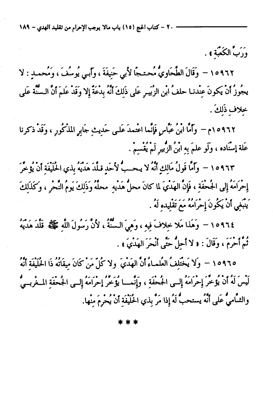 15965 - وَلَا يَخْتِلِفُ الْعُلَمَاءُ أَنَّ الْهَدْيَ، وَلَا كُلُّ مَنْ كَانَ مِيقَاتُهُ ذَا الْحُلَيْفَةَ أَنَّهُ لَيْسَ لَهُ أَنْ يُؤَخِّرَ إِحْرَامُهُ إِلَى الْجُحْفَةِ، وَإِنَّمَا يُؤَخِّرُ إِحْرَامَهُ إِلَى الْجُحْفَةِ الْمَغْرِبِيُّ وَالشَّامِيُّ عَلَى أَنَّهُ يُسْتَحَبُّ لَهُ إِذَا مَرَّ بِذِي الْحُلَيْفَةِ أَنْ يُحْرِمَ مِنْهَا.