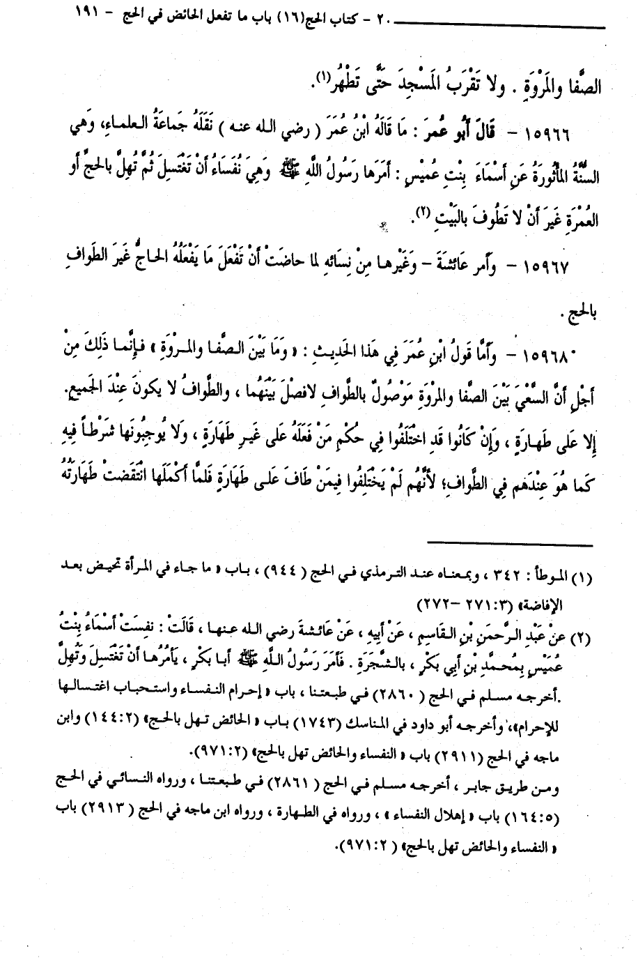 الصَّفَا وَالْمَرْوَةِ. وَلَا تَقْرَبُ الْمَسْجِدَ حَتَّى تَطْهُرَ.