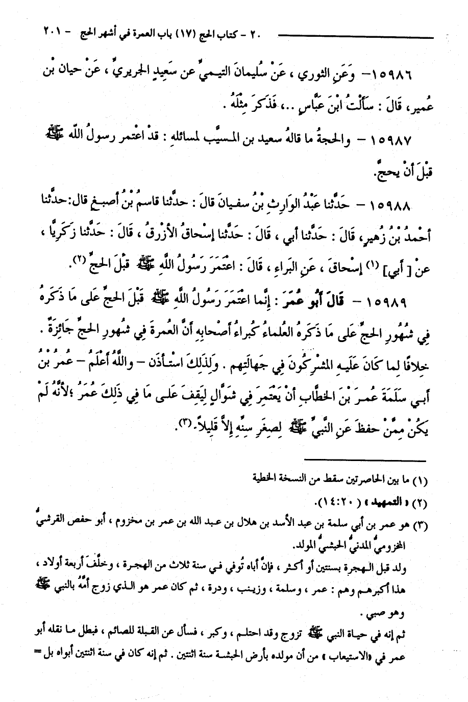 15989 - قَالَ أَبُو عُمَرَ: إِنَّمَا اعْتَمَرَ رَسُولُ اللَّهِ - صَلَّى اللَّهُ عَلَيْهِ وَسَلَّمَ - قَبْلَ الْحَجِّ عَلَى مَا ذَكَرَهُ فِي شُهُورِ الْحَجِّ عَلَى مَا ذَكَرَهُ الْعُلَمَاءُ كُبَرَاءُ أَصْحَابِهِ أَنَّ الْعُمْرَةَ فِي شُهُورِ الْحَجِّ جَائِزَةٌ. خِلَافًا لِمَا كَانَ عَلَيْهِ الْمُشْرِكُونَ فِي جَهَالَتِهِمْ. وَلِذَلِكَ اسْتَأْذَنَ - وَاللَّهُ أَعْلَمُ - عُمَرُ بْنُ أَبِي سَلَمَةَ عُمَرَ بْنَ الْخَطَّابِ أَنْ يَعْتَمِرَ فِي شَوَّالٍ لِيَقِفَ عَلَى مَا فِي ذَلِكَ عُمَرُ ; لِأَنَّهُ لَمْ يَكُنْ مِمَّنْ حَفِظَ عَنِ النَّبِيِّ - صَلَّى اللَّهُ عَلَيْهِ وَسَلَّمَ - لِصِغَرِ سِنِّهِ إِلَّا قَلِيلًا.
