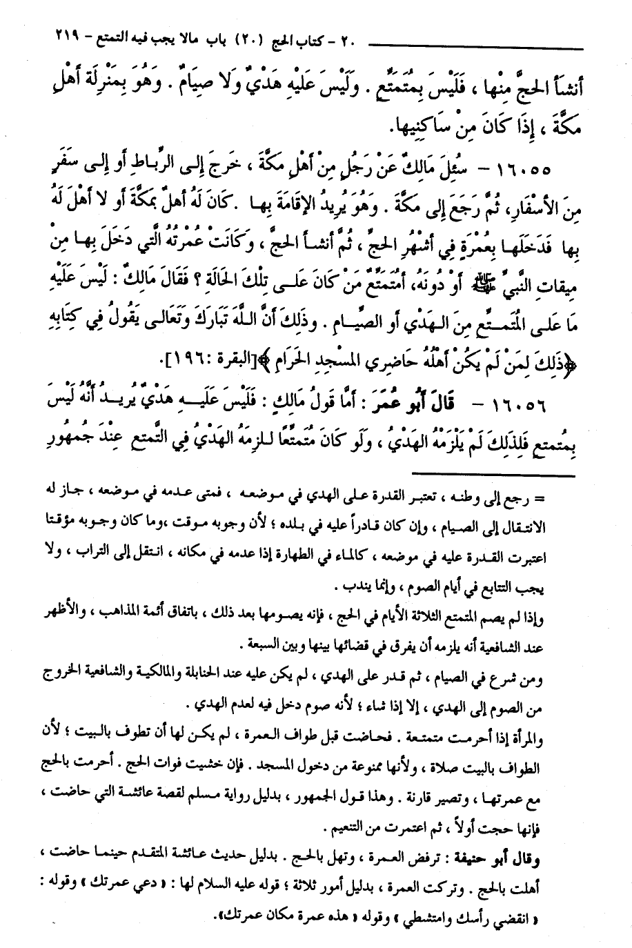 16055 - سُئِلَ مَالِكٌ عَنْ رَجُلٍ مِنْ أَهْلِ مَكَّةَ، خَرَجَ إِلَى الرِّبَاطِ أَوْ إِلَى سَفَرٍ مِنَ الْأَسْفَارِ، ثُمَّ رَجَعَ إِلَى مَكَّةَ. وَهُوَ يُرِيدُ الْإِقَامَةَ بِهَا. كَانَ لَهُ أَهْلٌ بِمَكَّةَ أَوْلَا أَهْلَ لَهُ بِهَا فَدَخَلَهَا بِعُمْرَةٍ فِي أَشْهُرِ الْحَجِّ، ثُمَّ أَنْشَأَ الْحَجَّ، وَكَانَتْ عُمْرَتُهُ الَّتِي دَخَلَ بِهَا مِنْ مِيقَاتِ النَّبِيِّ - صَلَّى اللَّهُ عَلَيْهِ وَسَلَّمَ - أَوْ دُونَهُ، أَمُتَمَتِّعٌ مَنْ كَانَ عَلَى تِلْكَ الْحَالَةِ ؟ فَقَالَ مَالِكٌ: لَيْسَ عَلَيْهِ مَا عَلَى الْمُتَمَتِّعِ مِنَ الْهَدْيِ أَوِ الصِّيَامِ. وَذَلِكَ أَنَّ اللَّهَ - تَبَارَكَ وَتَعَالَى - يَقُولُ فِي كِتَابِهِ: (ذَلِكَ لِمَنْ لَمْ يَكُنْ أَهْلُهُ حَاضِرِي الْمَسْجِدِ الْحَرَامِ ) [ الْبَقَرَةِ: 196 ].