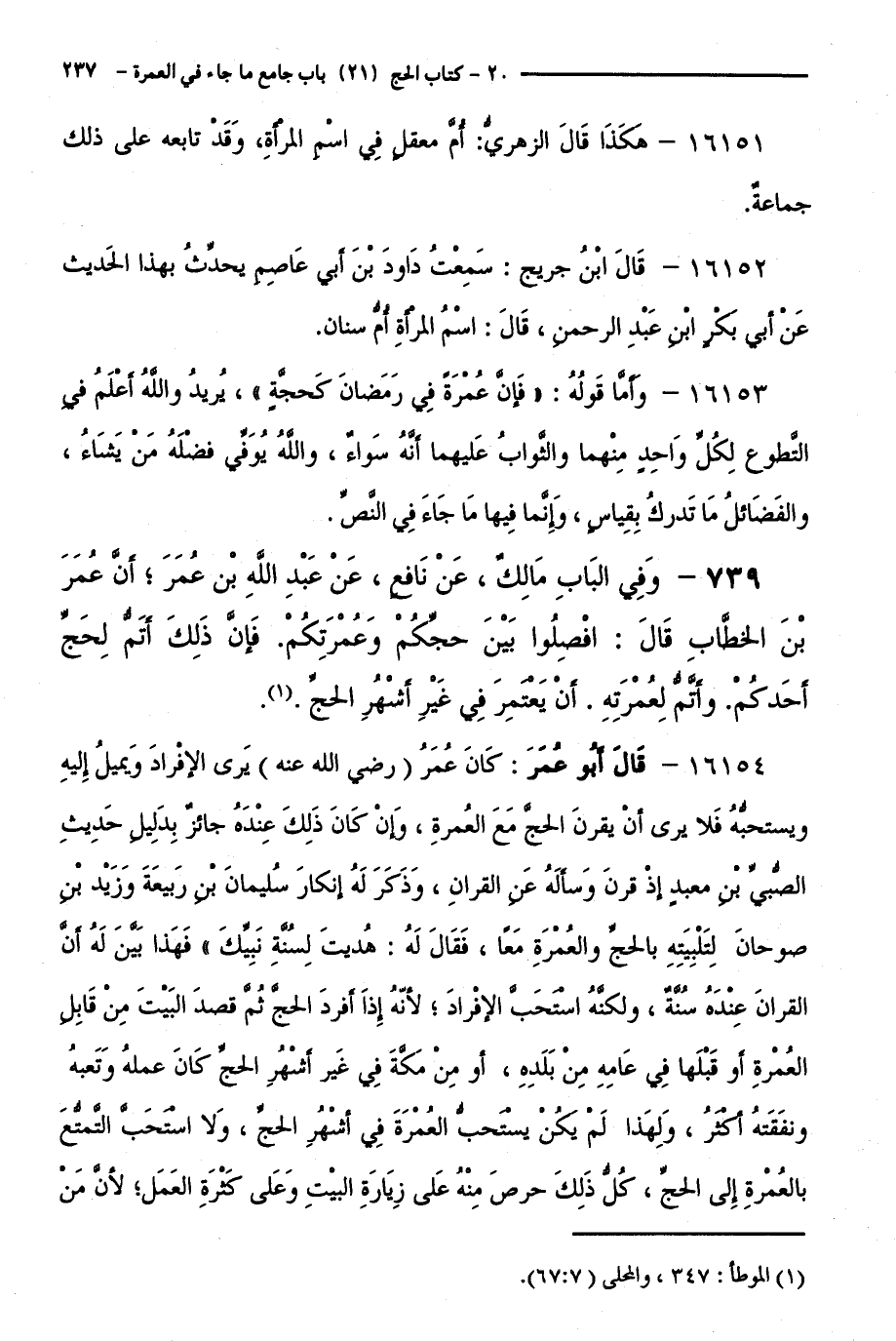 16154 - قَالَ أَبُو عُمَرَ: كَانَ عُمَرُ ( رَضِيَ اللَّهُ عَنْهُ ) يَرَى الْإِفْرَادَ وَيَمِيلُ إِلَيْهِ وَيَسْتَحِبُّهُ فَلَا يَرَى أَنْ يُقْرِنَ الْحَجَّ مَعَ الْعُمْرَةِ، وَإِنْ كَانَ ذَلِكَ عِنْدَهُ جَائِزٌ بِدَلِيلِ حَدِيثِ الصَّبِيِّ بْنِ مَعْبَدٍ إِذْ قَرَنَ وَسَأَلَهُ عَنِ الْقِرَانِ، وَذَكَرَ لَهُ إِنْكَارَ سُلَيْمَانَ بْنِ رَبِيعَةَ وَزَيْدِ بْنِ صُوحَانَ لِتَلْبِيَتِهِ بِالْحَجِّ وَالْعُمْرَةِ مَعًا، فَقَالَ لَهُ: " هُدِيتَ لِسُنَّةِ نَبِيِّكَ " فَهَذَا بَيَّنَ لَهُ أَنَّ الْقِرَانَ عِنْدَهُ سُنَّةٌ، وَلَكِنَّهُ اسْتَحَبَّ الْإِفْرَادَ ; لِأَنَّهُ إِذَا أَفْرَدَ الْحَجَّ ثُمَّ قَصَدَ الْبَيْتَ مِنْ قَابِلِ الْعُمْرَةِ أَوْ قَبْلَهَا فِي عَامِهِ مِنْ بَلَدِهِ، أَوْ مِنْ مَكَّةَ فِي غَيْرِ أَشْهُرِ الْحَجِّ كَانَ عَمَلُهُ وَتَعَبُهُ وَنَفَقَتُهُ أَكْثَرَ، وَلِهَذَا لَمْ يَكُنْ يَسْتَحِبُّ الْعُمْرَةَ فِي أَشْهُرِ الْحَجِّ، وَلَا اسْتَحَبَّ التَّمَتُّعَ بِالْعُمْرَةِ إِلَى الْحَجِّ، كُلُّ ذَلِكَ حِرْصٌ مِنْهُ عَلَى زِيَارَةِ الْبَيْتِ وَعَلَى كَثْرَةِ الْعَمَلِ ; لِأَنَّ مَنْ