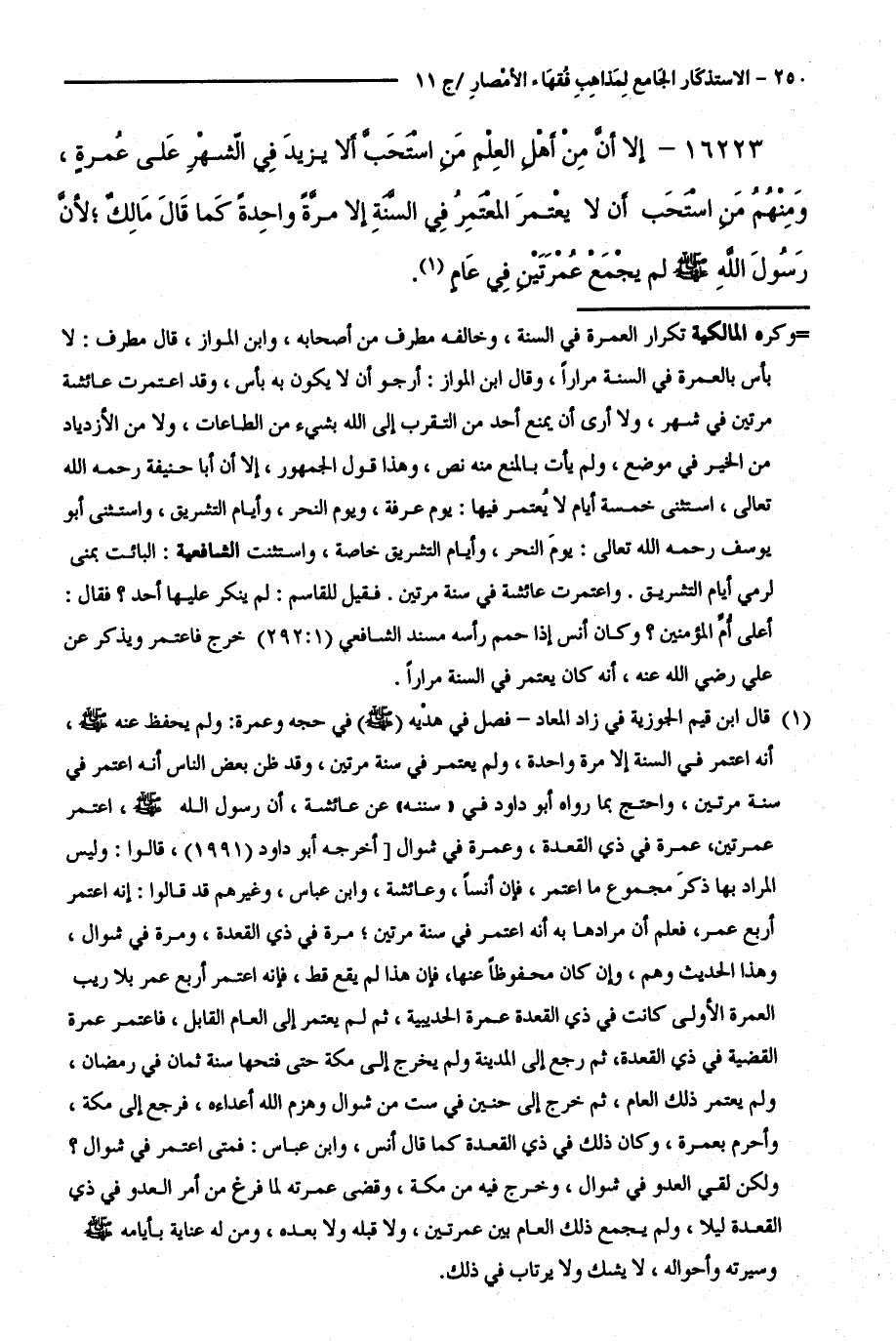 16223 - إِلَّا أَنَّ مِنْ أَهْلِ الْعِلْمِ مَنِ اسْتَحَبَّ أَلَّا يَزِيدَ فِي الشَّهْرِ عَلَى عُمْرَةٍ، وَمِنْهُمُ مَنِ اسْتَحَبَّ أَنْ لَا يَعْتَمِرَ الْمُعْتَمِرُ فِي السَّنَةِ إِلَّا مَرَّةً وَاحِدَةً كَمَا قَالَ مَالِكٌ ; لِأَنَّ رَسُولَ اللَّهِ - صَلَّى اللَّهُ عَلَيْهِ وَسَلَّمَ - لَمْ يَجْمَعْ عُمْرَتَيْنِ فِي عَامٍ.