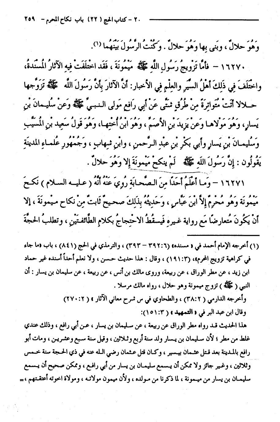 16271 - وَمَا أَعْلَمُ أَحَدًا مِنَ الصَّحَابَةِ رُوِيَ عَنْهُ أَنَّهُ ( عَلَيْهِ السَّلَامُ ) نَكَحَ مَيْمُونَةَ وَهُوَ مُحْرِمٌ إِلَّا ابْنَ عَبَّاسٍ، وَحَدِيثُهُ بِذَلِكَ صَحِيحٌ ثَابِتٌ مِنْ نِكَاحِ مَيْمُونَةَ، إِلَّا أَنْ يَكُونَ مُتَعَارِضًا مَعَ رِوَايَةِ غَيْرِهِ فَيَسْقُطُ الِاحْتِجَاجُ بِكَلَامِ الطَّائِفَتَيْنِ، وَتُطْلَبُ الْحُجَّةُ