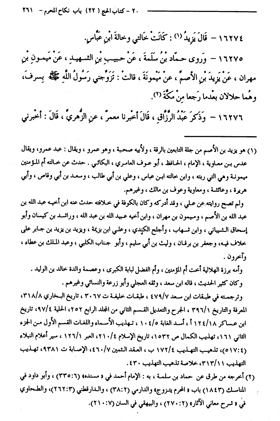 16275 - وَرَوَى حَمَادُ بْنُ سَلَمَةَ، عَنْ حَبِيبِ بْنِ الشَّهِيدِ، عَنْ مَيْمُونِ بْنِ مِهْرَانَ، عَنْ يَزِيدَ بْنِ الْأَصَمِّ، عَنْ مَيْمُونَةَ، قَالَتْ: تَزَوَّجَنِي رَسُولُ اللَّهِ - صَلَّى اللَّهُ عَلَيْهِ وَسَلَّمَ - بِسَرِفَ، وَهُمَا حَلَالَانِ بَعْدَمَا رَجَعَا مِنْ مَكَّةَ.
