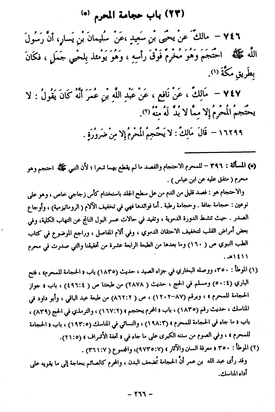 747 - مَالِكٌ، عَنْ نَافِعٍ، عَنْ عَبْدِ اللَّهِ بْنِ عُمَرَ أَنَّهُ كَانَ يَقُولُ: لَا يَحْتَجِمُ الْمُحْرِمُ إِلَّا مِمَّا لَا بُدَّ لَهُ مِنْهُ.