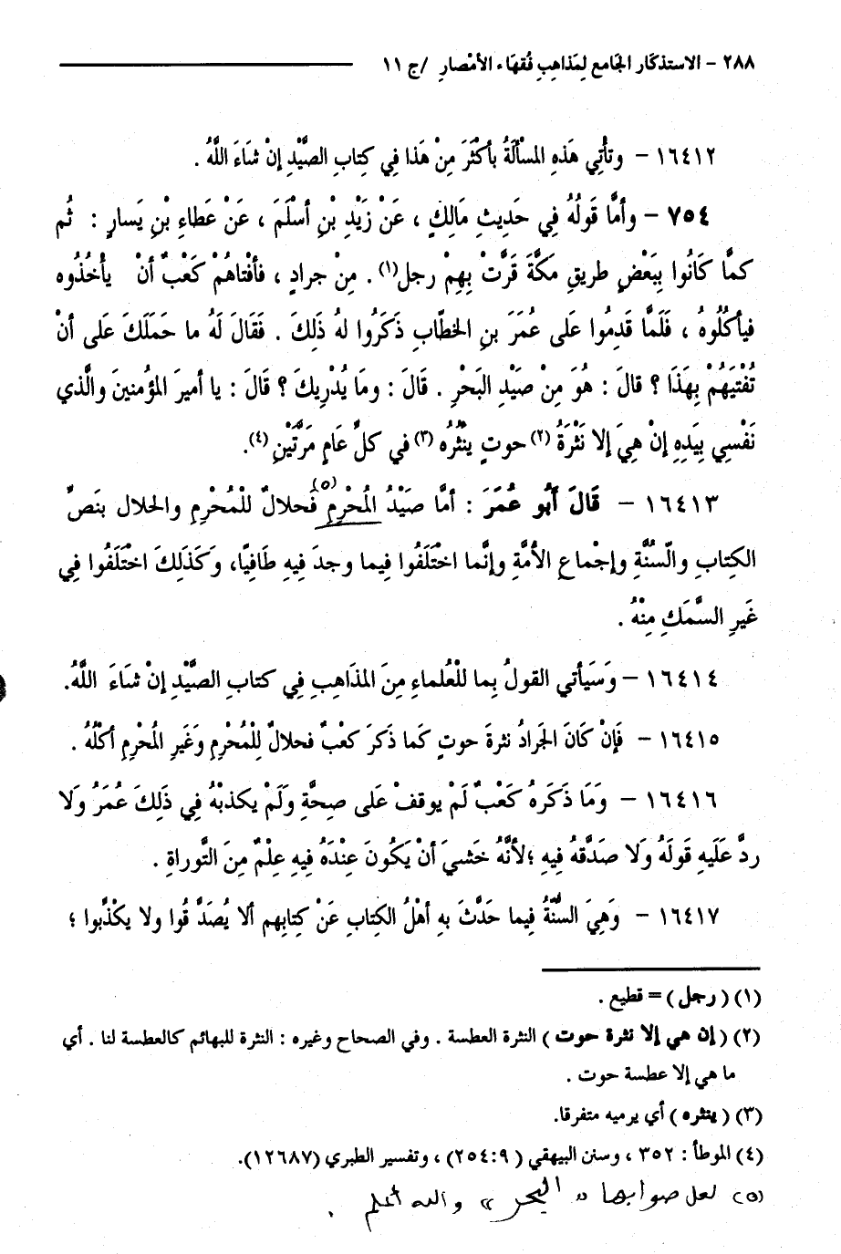 16415 - فَإِنْ كَانَ الْجَرَادُ نَثْرَةَ حُوتٍ كَمَا ذَكَرَ كَعْبٌ فَحَلَالٌ لِلْمُحْرِمِ وَغَيْرِ الْمُحْرِمِ أَكْلُهُ.