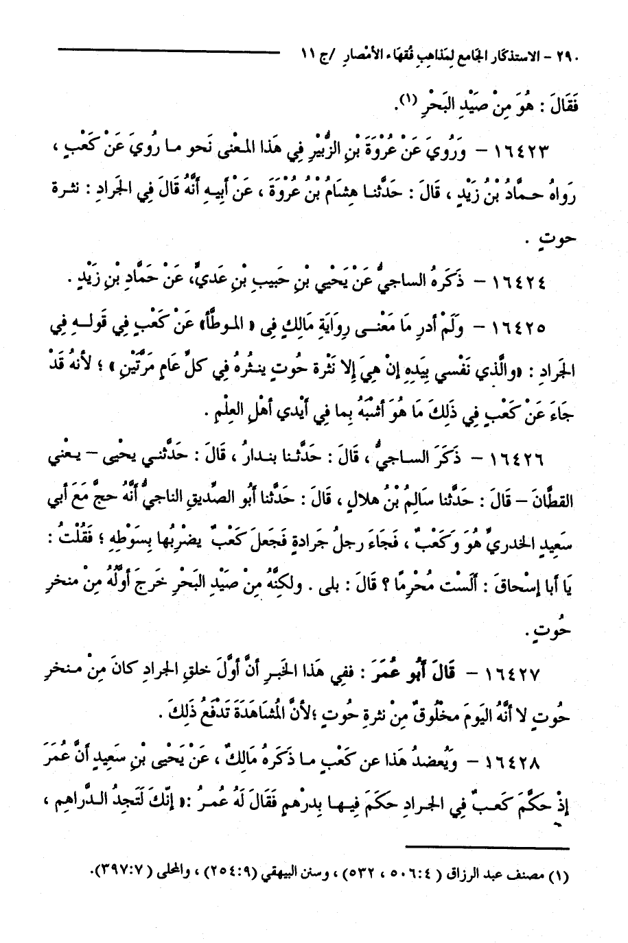 16425 - وَلَمْ أَدْرِ مَا مَعْنَى رِوَايَةِ مَالِكٍ فِي " الْمُوَطَّأِ " عَنْ كَعْبٍ فِي قَوْلِهِ فِي الْجَرَادِ: " وَالَّذِي نَفْسِي بِيَدِهِ إِنْ هِيَ إِلَّا نَثْرَةُ حُوتٍ يَنْثُرُهُ فِي كُلِّ عَامٍ مَرَّتَيْنِ " ; لِأَنَّهُ قَدْ جَاءَ عَنْ كَعْبٍ فِي ذَلِكَ مَا هُوَ أَشْبَهُ بِمَا فِي أَيْدِي أَهْلِ الْعِلْمِ.