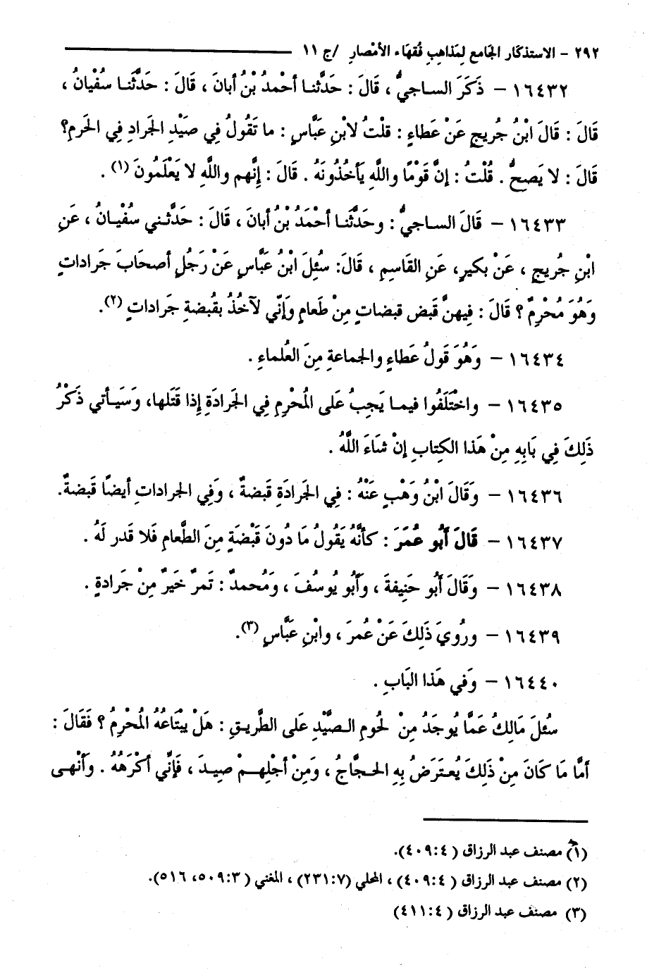 16432 - ذَكَرَ السَّاجِيُّ، قَالَ: حَدَّثَنَا أَحْمَدُ بْنُ أَبَانٍ، قَالَ: حَدَّثَنَا سُفْيَانُ، قَالَ: قَالَ ابْنُ جُرَيْجٍ عَنْ عَطَاءٍ: قُلْتُ لِابْنِ عَبَّاسٍ: مَا تَقُولُ فِي صَيْدِ الْجَرَادِ فِي الْحَرَمِ ؟ قَالَ: لَا يَصِحُّ. قُلْتُ: إِنَّ قَوْمًا وَاللَّهِ يَأْخُذُونَهُ. قَالَ: إِنَّهُمْ وَاللَّهِ لَا يَعْلَمُونَ.