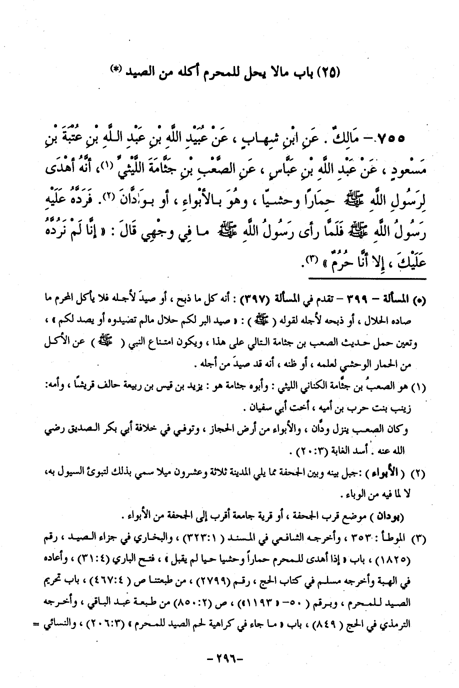 755 - مَالِكٌ. عَنِ ابْنِ شِهَابٍ، عَنْ عُبَيْدِ اللَّهِ بْنِ عَبْدِ اللَّهِ بْنِ عُتْبَةَ بْنِ مَسْعُودٍ، عَنْ عَبْدِ اللَّهِ بْنِ عَبَّاسٍ، عَنِ الصَّعْبِ بْنِ جَثَّامَةَ اللَّيْثِيِّ، أَنَّهُ أَهْدَى لِرَسُولِ اللَّهِ - صَلَّى اللَّهُ عَلَيْهِ وَسَلَّمَ - حِمَارًا وَحْشِيًّا، وَهُوَ بِالْأَبْوَاءِ، أَوْ بِوَدَّانَ. فَرَدَّهُ عَلَيْهِ رَسُولُ اللَّهِ - صَلَّى اللَّهُ عَلَيْهِ وَسَلَّمَ - فَلَمَّا رَأَى رَسُولُ اللَّهِ - صَلَّى اللَّهُ عَلَيْهِ وَسَلَّمَ - مَا فِي وَجْهِي قَالَ: " إِنَّا لَمْ نَرُدُّهُ عَلَيْكَ، إِلَّا أَنَّا حُرُمٌ ".