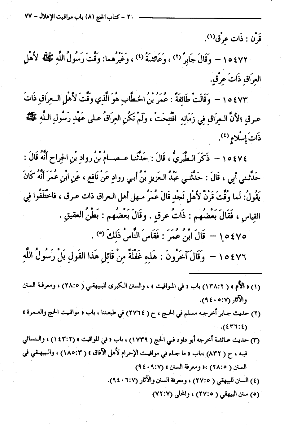 15474 - ذَكَرَ الطَّبَرِيُّ، قَالَ: حَدَّثَنَا عِصَامُ بْنُ رَوَّادِ بْنِ الْجِرَاحِ أَنَّهُ قَالَ: حَدَّثَنِي أَبِي، قَالَ: حَدَّثَنِي عَبْدُ الْعَزِيزِ بْنُ أَبِي رَوَّادٍ عَنْ نَافِعٍ، عَنِ ابْنِ عُمَرَ أَنَّهُ كَانَ يَقُولُ: لَمَّا وُقِّتَ قَرْنٌ لِأَهْلِ نَجْدٍ قَالَ عُمَرُ مَهَلُّ أَهْلِ الْعِرَاقِ ذَاتُ عِرْقٍ، فَاخْتَلَفُوا فِي الْقِيَاسِ، فَقَالَ بَعْضُهُمْ: ذَاتُ عِرْقٍ. وَقَالَ بَعْضُهُمْ: بَطْنُ الْعَقِيقِ.