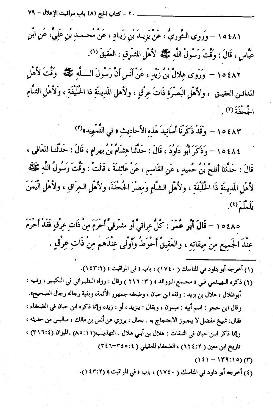 15482 - وَرَوَى هِلَالُ بْنُ زَيْدٍ، عَنْ أَنَسٍ أَنَّ رَسُولَ اللَّهِ - صَلَّى اللَّهُ عَلَيْهِ وَسَلَّمَ - وَقَّتَ لِأَهْلِ الْمَدَائِنِ الْعَقِيقَ، وَلِأَهْلِ الْبَصْرَةِ ذَاتَ عِرْقٍ، وَلِأَهْلِ الْمَدِينَةِ ذَا الْحُلَيْفَةِ، وَلِأَهْلِ الشَّامِ الْجُحْفَةَ.