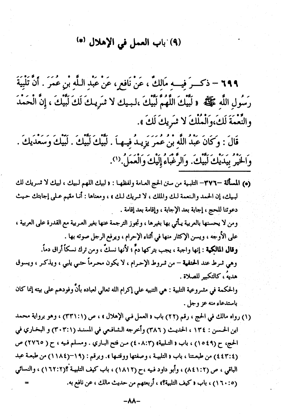 699 - ذَكَرَ فِيهِ مَالِكٌ، عَنْ نَافِعٍ، عَنْ عَبْدِ اللَّهِ بْنِ عُمَرَ. أَنَّ تَلْبِيَةَ رَسُولِ اللَّهِ - صَلَّى اللَّهُ عَلَيْهِ وَسَلَّمَ - " لَبَّيْكَ اللَّهُمَّ لَبَّيْكَ، لَبَّيْكَ لَا شَرِيكَ لَكَ لَبَّيْكَ، إِنَّ الْحَمْدَ وَالنِّعْمَةَ لَكَ وَالْمُلْكَ، لَا شَرِيكَ لَكَ ".