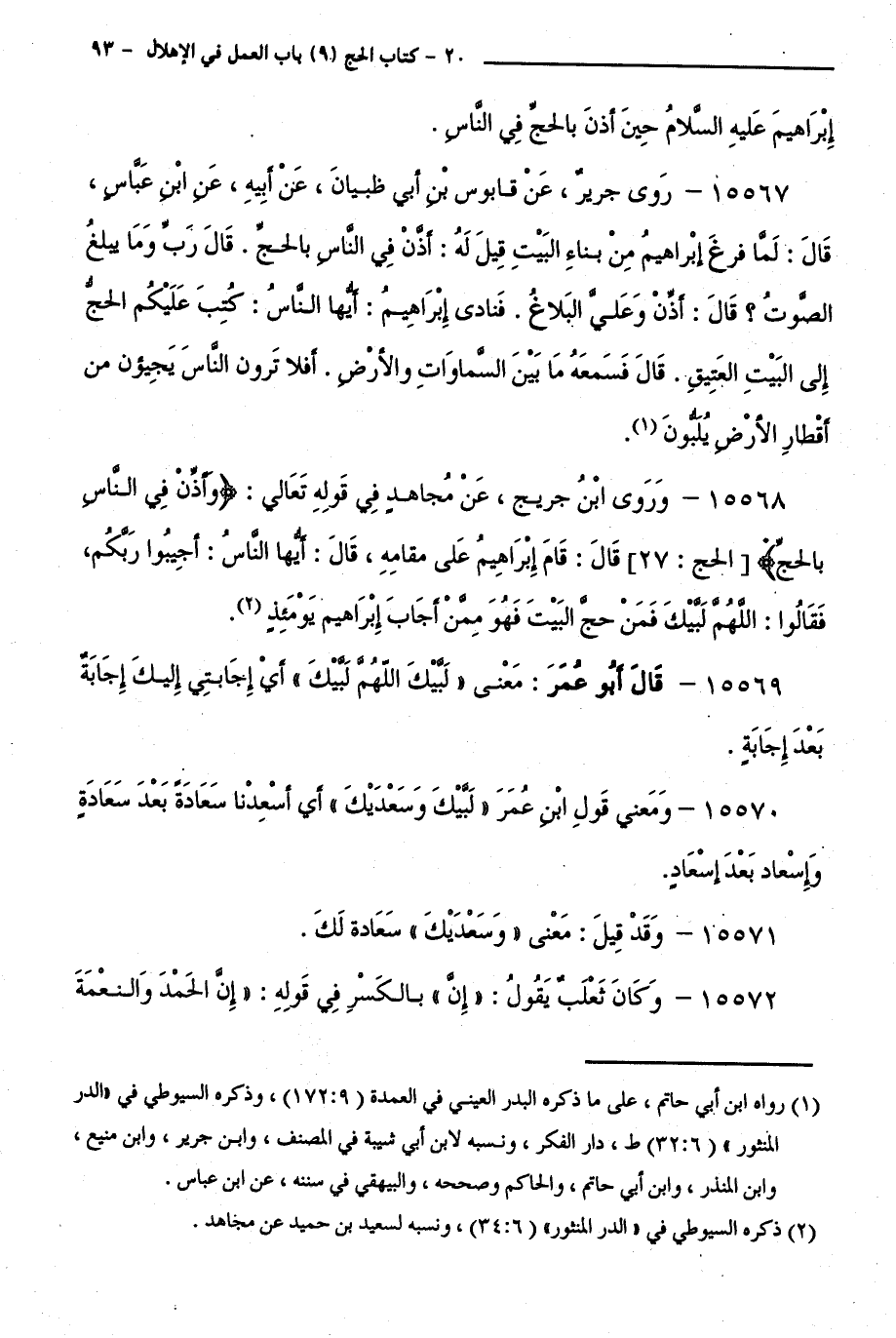 15567 - رَوَى جَرِيرٌ، عَنْ قَابُوسَ بْنِ أَبِي ظَبْيَانَ، عَنْ أَبِيهِ، عَنِ ابْنِ عَبَّاسٍ، قَالَ: " لَمَّا فَرَغَ إِبْرَاهِيمُ مِنْ بِنَاءِ الْبَيْتِ قِيلَ لَهُ: أَذِّنْ فِي النَّاسِ بِالْحَجِّ. قَالَ: رَبِّ وَمَا يَبْلُغُ الصَّوْتُ ؟ قَالَ: أَذِّنْ وَعَلَيَّ الْبَلَاغُ. فَنَادَى إِبْرَاهِيمُ: أَيُّهَا النَّاسُ، كُتِبَ عَلَيْكُمُ الْحَجُّ إِلَى الْبَيْتِ الْعَتِيقِ. قَالَ فَسَمِعَهُ مَا بَيْنَ السَّمَاوَاتِ وَالْأَرْضِ. أَفَلَا تَرَوْنَ النَّاسَ يَجِيئُونَ مِنْ أَقْطَارِ الْأَرْضِ يُلَبُّونَ.