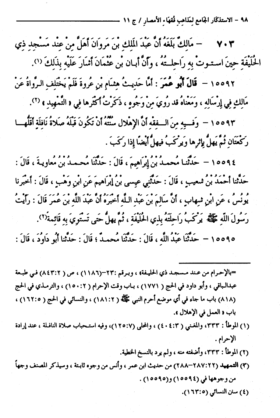 703 - مَالِكٌ بَلَغَهُ أَنَّ عَبْدَ الْمَلِكِ بْنَ مَرْوَانَ أَهَلَّ مِنْ عِنْدِ مَسْجِدِ ذِي الْحُلَيْفَةِ حِينَ اسْتَوَتْ بِهِ رَاحِلَتُهُ، وَأَنَّ أَبَانَ بْنَ عُثْمَانَ أَشَارَ عَلَيْهِ بِذَلِكَ.
