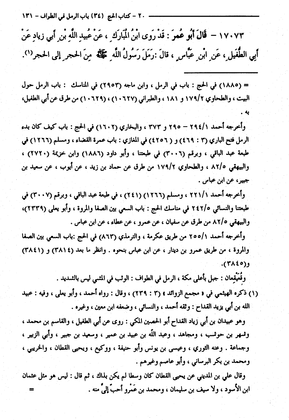 17073 - قَالَ أَبُو عُمَرَ: قَدْ رَوَى ابْنُ الْمُبَارَكِ، عَنْ عُبَيْدِ اللَّهِ بْنِ أَبِي زِيَادٍ عَنْ أَبِي الطُّفَيْلِ، عَنِ ابْنِ عَبَّاسٍ، قَالَ: رَمَلَ رَسُولُ اللَّهِ مِنَ الْحَجَرِ إِلَى الْحَجَرِ.