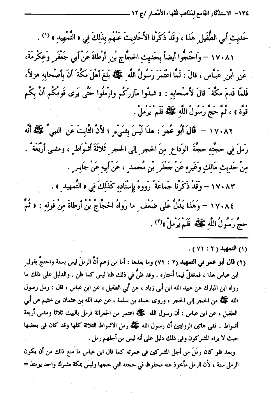 17082 - قَالَ أَبُو عُمَرَ: هَذَا لَيْسَ بِشَيْءٍ ; لِأَنَّ الثَّابِتَ عَنِ النَّبِيِّ - صَلَّى اللَّهُ عَلَيْهِ وَسَلَّمَ - أَنَّهُ رَمَلَ فِي حَجَّتِهِ حَجَّةِ الْوَدَاعِ مِنَ الْحَجَرِ إِلَى الْحَجَرِ ثَلَاثَةَ أَشْوَاطٍ، وَمَشَى أَرْبَعَةً. مِنْ حَدِيثِ مَالِكٍ وَغَيْرِهِ عَنْ جَعْفَرِ بْنِ مُحَمَّدٍ، عَنْ أَبِيهِ عَنْ جَابِرٍ.