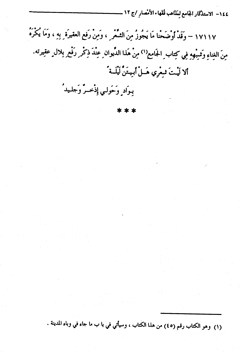 17117 - وَقَدْ أَوْضَحْنَا مَا يَجُوزُ مِنَ الشِّعْرِ، وَمِنْ رَفْعِ الْعَقِيرَةِ بِهِ، وَمَا يُكْرَهُ مِنَ الْغِنَاءِ وَشِبْهِهِ فِي كِتَابِ الْجَامِعِ مِنْ هَذَا الدِّيوَانِ عِنْدَ ذِكْرِ رَفْعِ بِلَالٍ عَقِيرَتَهُ.