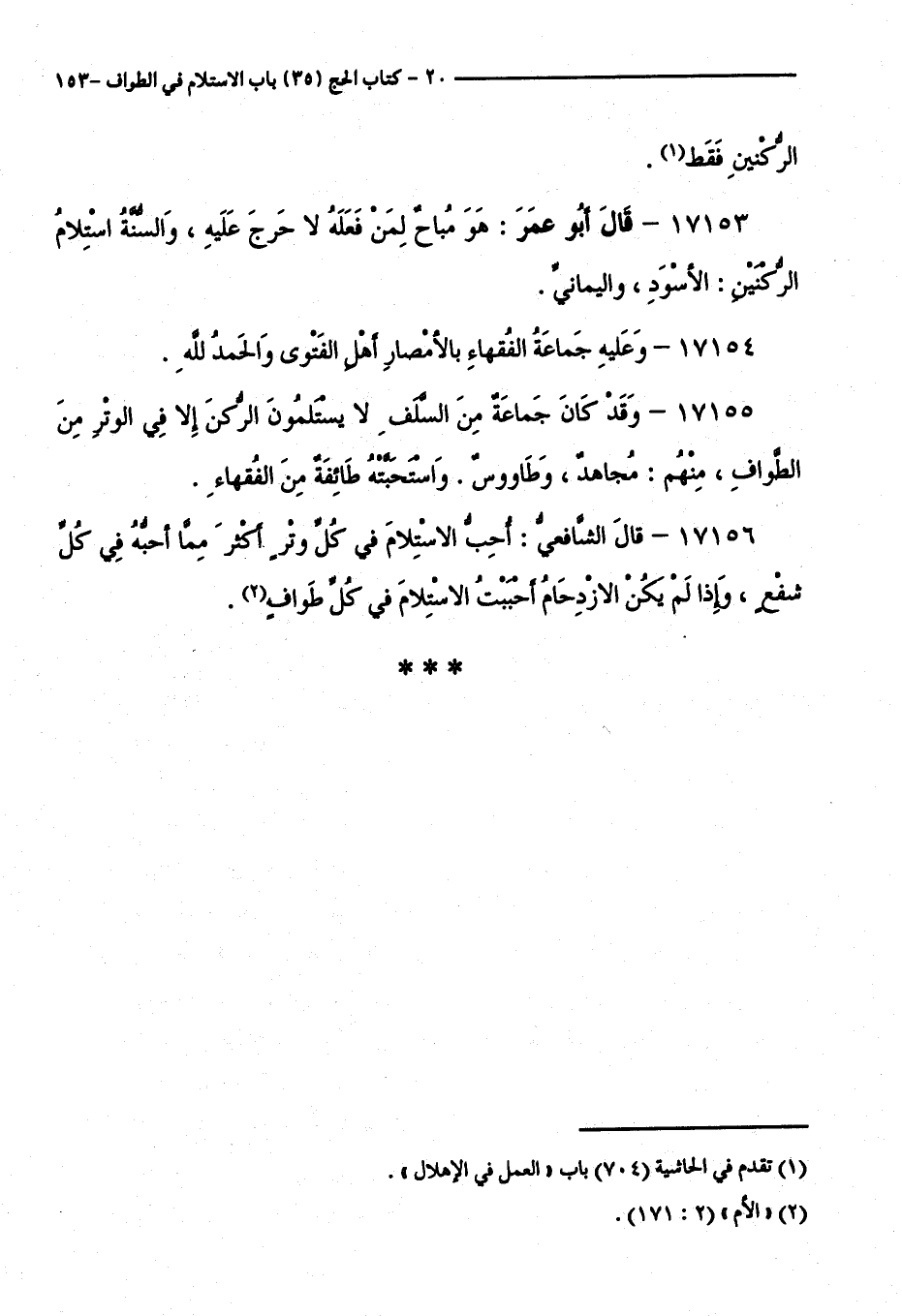 17155 - وَقَدْ كَانَ جَمَاعَةٌ مِنَ السَّلَفِ لَا يَسْتَلِمُونَ الرُّكْنَ إِلَّا فِي الْوِتْرِ مِنَ الطَّوَافِ، مِنْهُمْ: مُجَاهِدٌ، وَطَاوُسٌ. وَاسْتَحَبَّتْهُ طَائِفَةٌ مِنَ الْفُقَهَاءِ.