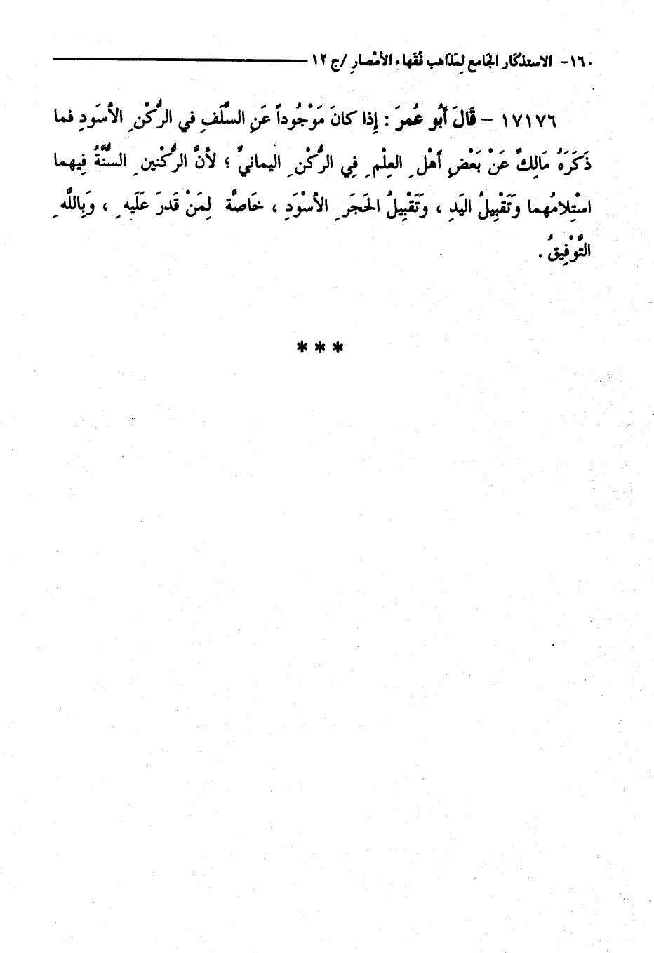 17176 - قَالَ أَبُو عُمَرَ: إِذَا كَانَ مَوْجُودًا عَنِ السَّلَفِ فِي الرُّكْنِ الْأَسْوَدِ فَمَا ذَكَرَهُ مَالِكٌ عَنْ بَعْضِ أَهْلِ الْعِلْمِ فِي الرُّكْنِ الْيَمَانِيِّ ; لِأَنَّ الرُّكْنَيْنِ السُّنَّةُ فِيهِمَا اسْتِلَامُهُمَا وَتَقْبِيلُ الْيَدِ، وَتَقْبِيلُ الْحَجَرِ الْأَسْوَدِ، خَاصَّةً لِمَنْ قَدَرَ عَلَيْهِ، وَبِاللَّهِ التَّوْفِيقُ.