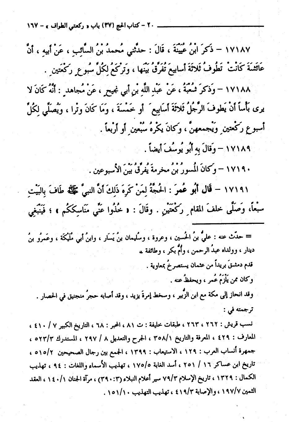 17187 - ذَكَرَ ابْنُ عُيَيْنَةَ، قَالَ: حَدَّثَنِي مُحَمَّدُ بْنُ السَّائِبِ، عَنْ أَبِيهِ، أَنَّ عَائِشَةَ كَانَتْ تَطُوفُ ثَلَاثَةَ أَسَابِيعَ تُفَرِّقُ بَيْنَهَا، وَتَرْكَعُ لِكُلِّ سُبُوعٍ رَكْعَتَيْنِ.