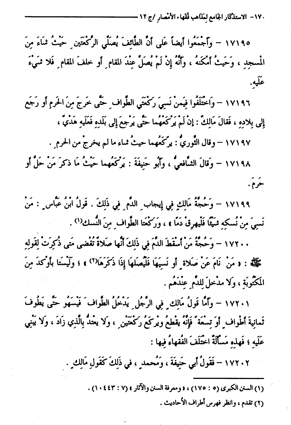 17196 - وَاخْتَلَفُوا فِيمَنْ نَسِيَ رَكْعَتَيِ الطَّوَافِ حَتَّى خَرَجَ مِنَ الْحَرَمِ أَوْ رَجَعَ إِلَى بِلَادِهِ، فَقَالَ مَالِكٌ: إِنْ لَمْ يَرْكَعْهُمَا حَتَّى يَرْجِعَ إِلَى بَلَدِهِ فَعَلَيْهِ هَدْيٌ.