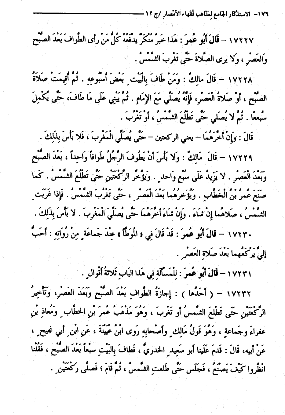 17227 - قَالَ أَبُو عُمَرَ: هَذَا خَبَرٌ مُنْكَرٌ يَدْفَعُهُ كُلُّ مَنْ رَأَى الطَّوَافَ بَعْدَ الصُّبْحِ وَالْعَصْرِ، وَلَا يَرَى الصَّلَاةَ حَتَّى تَغْرُبَ الشَّمْسُ.