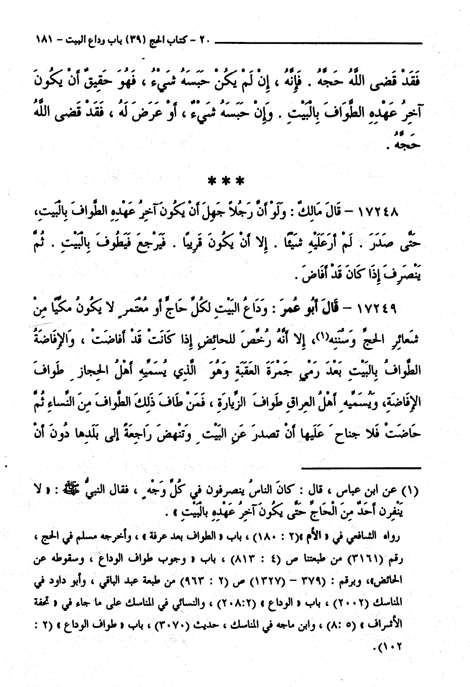 17249 - قَالَ أَبُو عُمَرَ: وَدَاعُ الْبَيْتِ لِكُلِّ حَاجٍّ أَوْ مُعْتَمِرٍ لَا يَكُونُ مَكِّيًّا مِنْ شَعَائِرِ الْحَجِّ وَسُنَنِهِ، إِلَّا أَنَّهُ رُخِّصَ لِلْحَائِضِ إِذَا كَانَتْ قَدْ أَفَاضَتْ، وَالْإِفَاضَةُ الطَّوَافُ بِالْبَيْتِ بَعْدَ رَمْيِ جَمْرَةِ الْعَقَبَةِ وَهُوَ الَّذِي يُسَمِّيهِ أَهْلُ الْحِجَازِ طَوَافَ الْإِفَاضَةِ، وَيُسَمِّيهِ أَهْلُ الْعِرَاقِ طَوَافَ الزِّيَارَةِ، فَمَنْ طَافَ ذَلِكَ الطَّوَافَ مِنَ النِّسَاءِ ثُمَّ حَاضَتْ فَلَا جُنَاحَ عَلَيْهَا أَنْ تَصْدُرَ عَنِ الْبَيْتِ وَتَنْهَضَ رَاجِعَةً إِلَى بَلَدِهَا دُونَ أَنْ