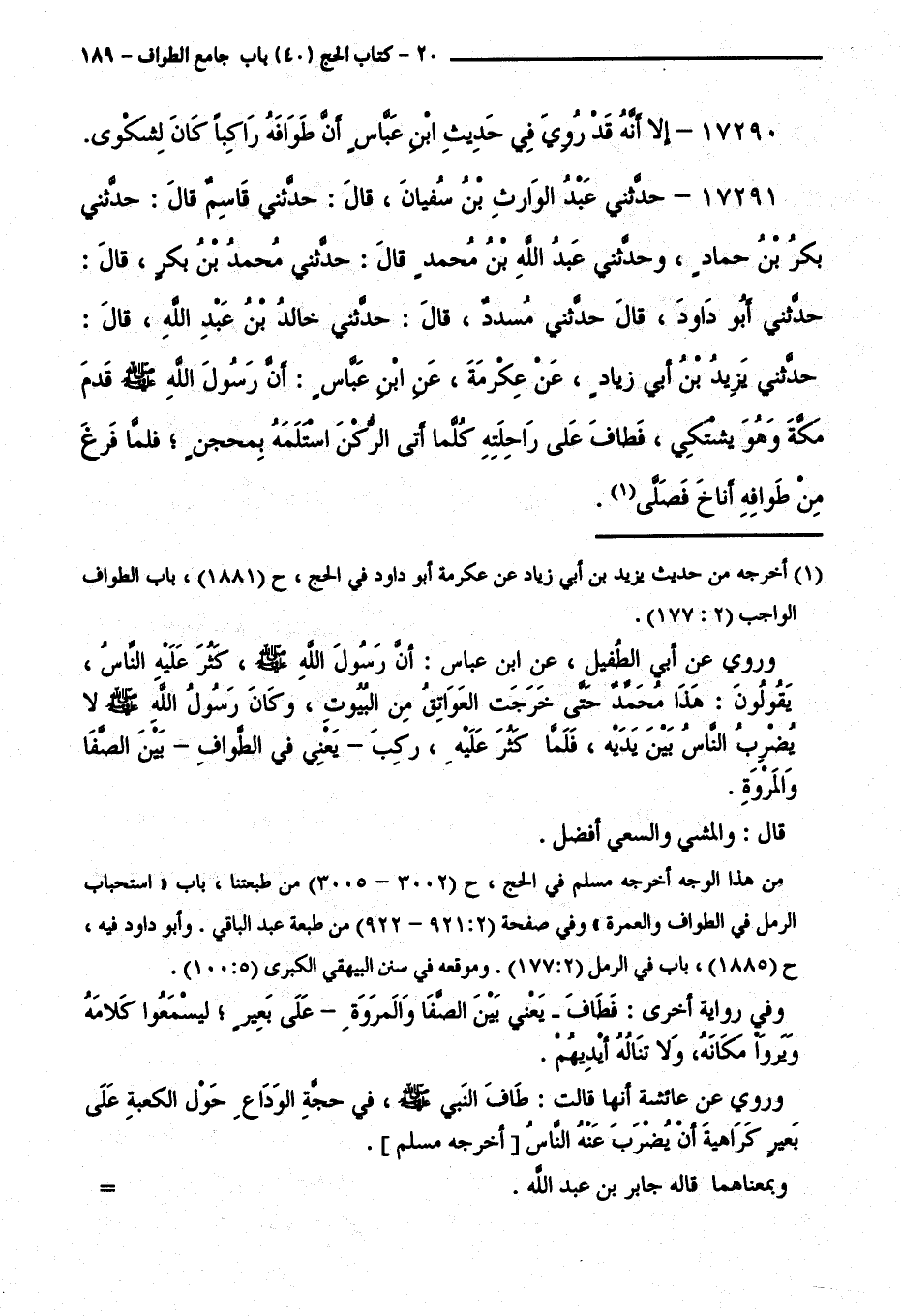 17291 - حَدَّثَنِي عَبْدُ الْوَارِثِ بْنُ سُفْيَانَ، قَالَ: حَدَّثَنِي قَاسِمٌ قَالَ: حَدَّثَنِي بَكْرُ بْنُ حَمَّادٍ، وَحَدَّثَنِي عَبْدُ اللَّهِ بْنُ مُحَمَّدٍ قَالَ: حَدَّثَنِي مُحَمَّدُ بْنُ بَكْرٍ، قَالَ: حَدَّثَنِي أَبُو دَاوُدَ، قَالَ حَدَّثَنِي مُسَدَّدٌ، قَالَ: حَدَّثَنِي خَالِدُ بْنُ عَبْدِ اللَّهِ. قَالَ: حَدَّثَنِي يَزِيدُ بْنُ أَبِي زِيَادٍ، عَنْ عِكْرِمَةَ، عَنِ ابْنِ عَبَّاسٍ: أَنَّ رَسُولَ اللَّهِ - صَلَّى اللَّهُ عَلَيْهِ وَسَلَّمَ - قَدِمَ مَكَّةَ وَهُوَ يَشْتَكِي، فَطَافَ عَلَى رَاحِلَتِهِ كُلَّمَا أَتَى الرُّكْنَ اسْتَلَمَهُ بِمِحْجَنٍ، فَلَمَّا فَرَغَ مِنْ طَوَافِهِ أَنَاخَ فَصَلَّى.