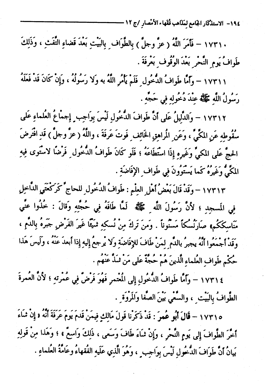 17315 - قَالَ أَبُو عُمَرَ: قَدْ ذَكَرْنَا قَوْلَ مَالِكٍ فِيمَنْ قَدِمَ يَوْمَ عَرَفَةَ أَنَّهُ " إِنْ شَاءَ أَخَّرَ الطَّوَافَ إِلَى يَوْمِ النَّحْرِ، وَإِنْ شَاءَ طَافَ وَسَعَى، ذَلِكَ وَاسِعٌ "، وَهَذَا مِنْ قَوْلِهِ بَيَانُ أَنَّ طَوَافَ الدُّخُولِ لَيْسَ بِوَاجِبٍ، وَهُوَ الَّذِي عَلَيْهِ الْفُقَهَاءُ وَعَامَّةُ الْعُلَمَاءِ.