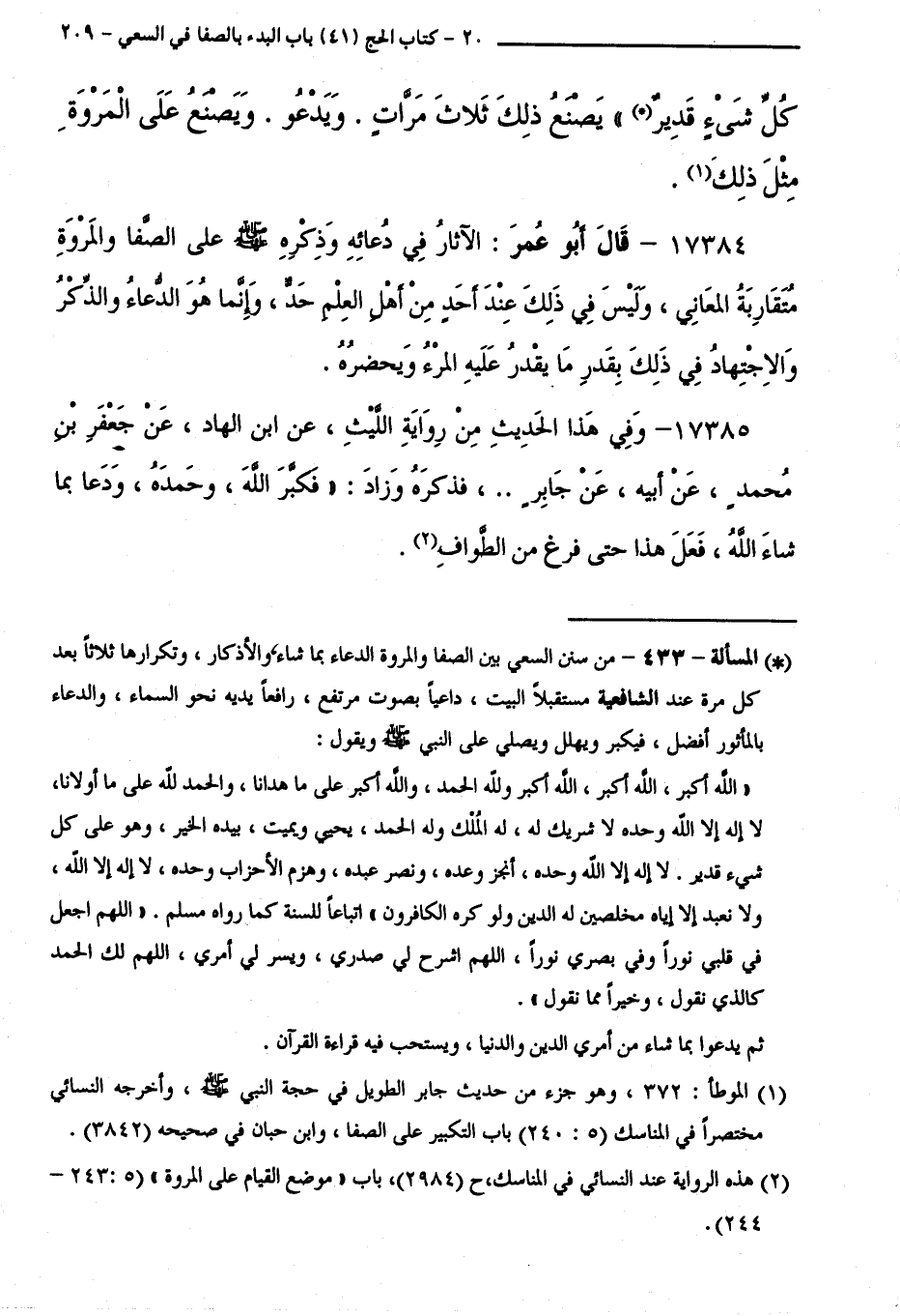 17384 - قَالَ أَبُو عُمَرَ: الْآثَارُ فِي دُعَائِهِ وَذِكْرِهِ - صَلَّى اللَّهُ عَلَيْهِ وَسَلَّمَ - عَلَى الصَّفَا وَالْمَرْوَةِ مُتَقَارِبَةُ الْمَعَانِي، وَلَيْسَ فِي ذَلِكَ عِنْدَ أَحَدٍ مِنْ أَهْلِ الْعِلْمِ حَدٌّ، وَإِنَّمَا هُوَ الدُّعَاءُ وَالذِّكْرُ وَالِاجْتِهَادُ فِي ذَلِكَ بِقَدْرِ مَا يَقْدِرُ عَلَيْهِ الْمَرْءُ وَيَحْضُرُهُ.