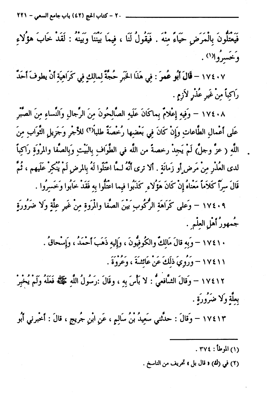 17407 - قَالَ أَبُو عُمَرَ: فِي هَذَا الْخَبَرِ حُجَّةٌ لِمَالِكٍ فِي كَرَاهِيَةِ أَنْ يَطُوفَ أَحَدٌ رَاكِبًا مِنْ غَيْرِ عُذْرٍ لَازِمٍ.