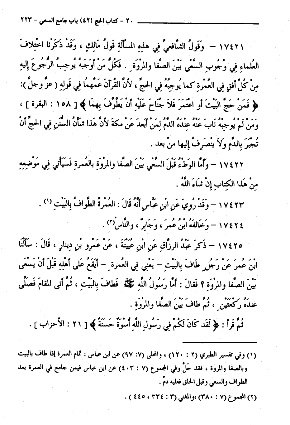 17425 - ذَكَرَ عَبْدُ الرَّزَّاقِ عَنِ ابْنِ عُيَيْنَةَ، عَنْ عَمْرِو بْنِ دِينَارٍ، قَالَ: سَأَلْنَا ابْنَ عُمَرَ عَنْ رَجُلٍ طَافَ بِالْبَيْتِ - يَعْنِي فِي الْعُمْرَةِ - أَيَقَعُ عَلَى أَهْلِهِ قَبْلَ أَنْ يَسْعَى بَيْنَ الصَّفَا وَالْمَرْوَةِ ؟ فَقَالَ: أَمَّا رَسُولُ اللَّهِ - صَلَّى اللَّهُ عَلَيْهِ وَسَلَّمَ - فَطَافَ بِالْبَيْتِ، ثُمَّ أَتَى الْمَقَامَ فَصَلَّى عِنْدَهُ رَكْعَتَيْنِ، ثُمَّ طَافَ بَيْنَ الصَّفَا وَالْمَرْوَةِ. ثُمَّ قَرَأَ:لَقَدْ كَانَ لَكُمْ فِي رَسُولِ اللَّهِ أُسْوَةٌ حَسَنَةٌ [ 21: الْأَحْزَابِ ].